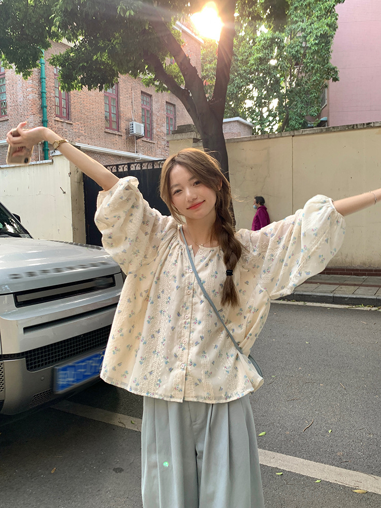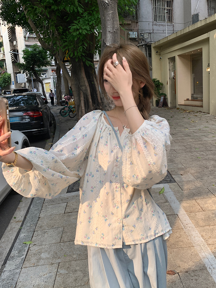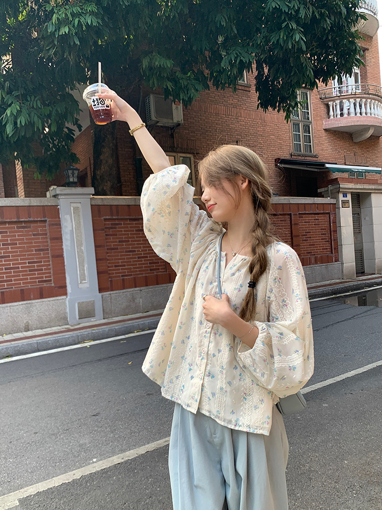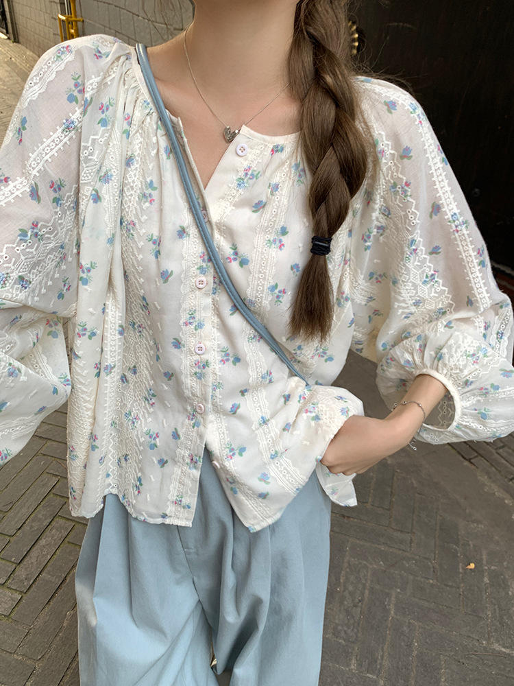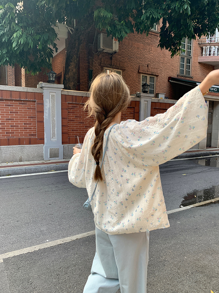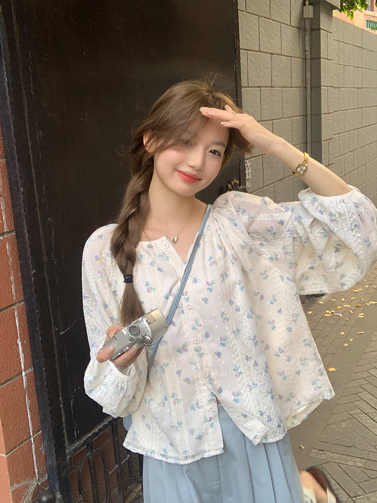 작고 상큼한 연령 감소 탑, 꽃무늬 긴팔 셔츠, 작은 사람들을 위한 루즈하고 슬림한 라운드 넥, 달콤하고 여성스러운 쉬폰 셔츠스토어 가기
