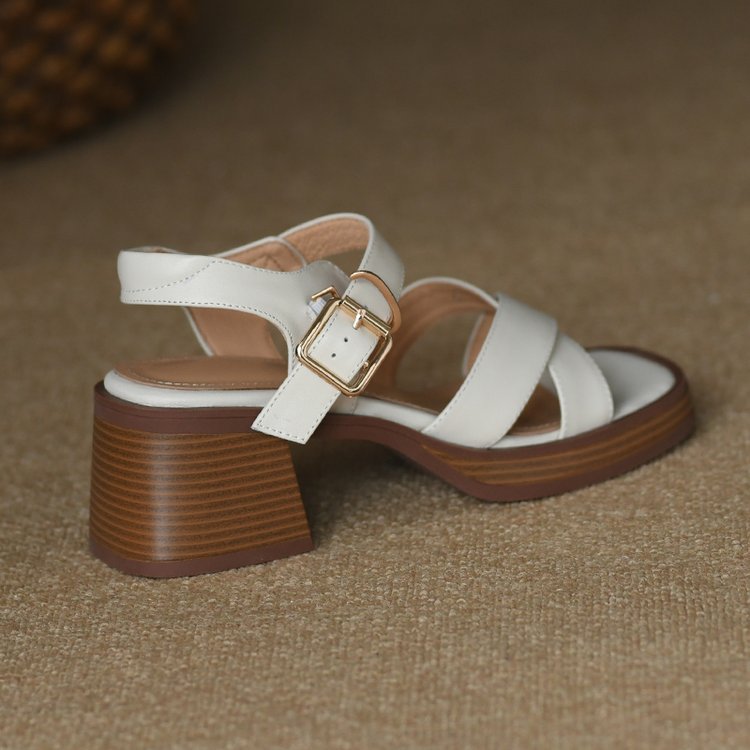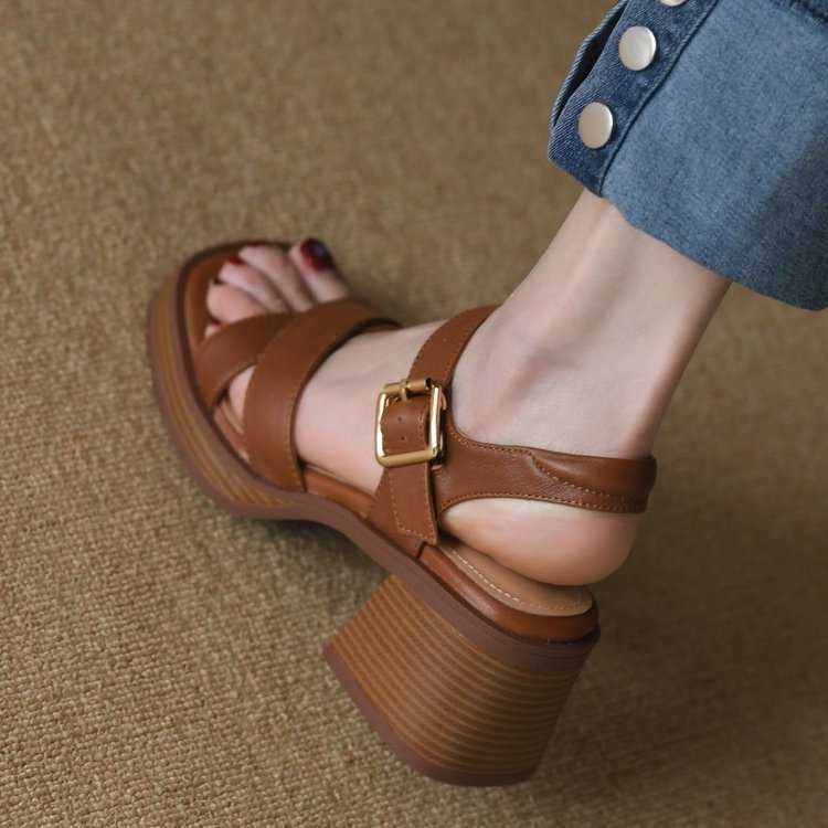 2025 여름 부드러운 가죽 두꺼운 굽 복고풍 갈색 샌들 여성 여름 크로스 스트랩 하이힐 메리 제인 샌들스토어 가기