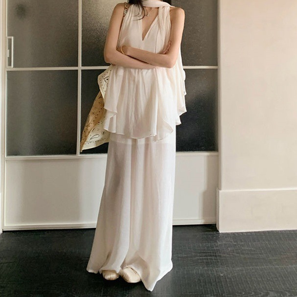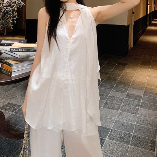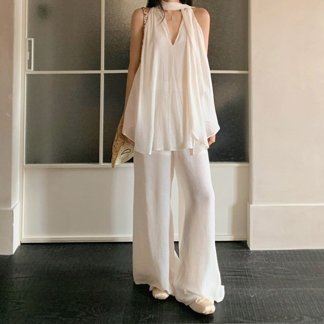 한국 패션 달콤한 민소매 브이넥 홀터넥 리본 하이엔드 탑 여름 루즈 캐주얼 와이드 팬츠 슈트스토어 가기