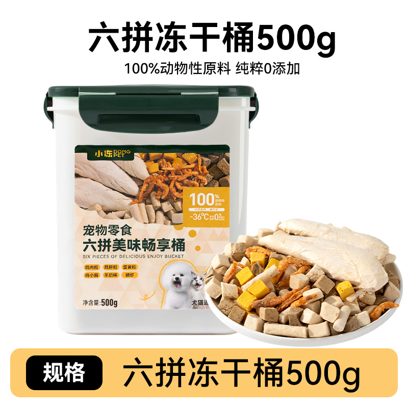 소형 냉동 혼합 동결 건조 통 6개 치킨, 생선, 계란 노른자 500g 포상 비빔밥 스낵 통 애완견 및 고양이스토어 가기