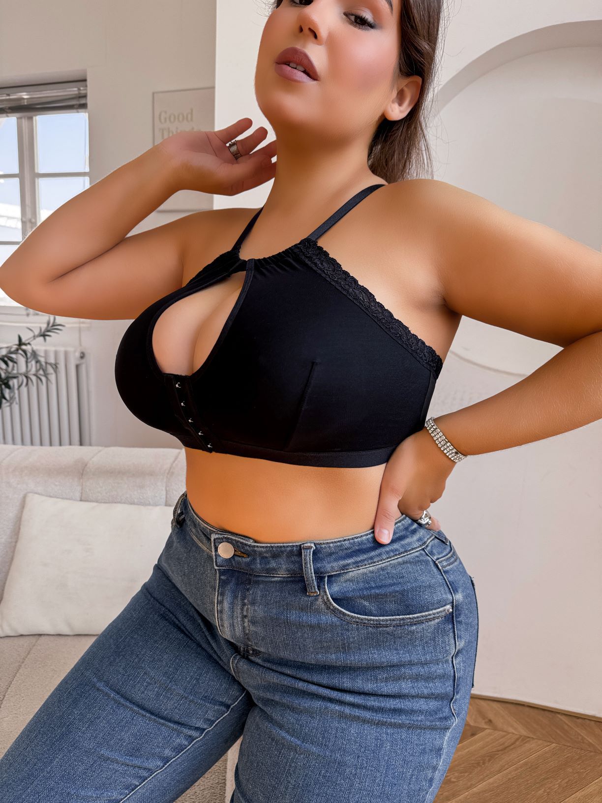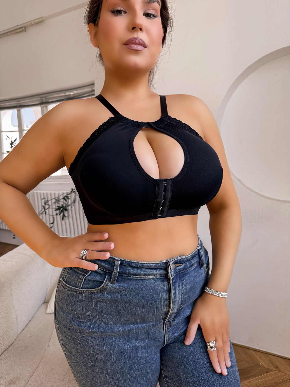 국경을 넘는 TEMU 새로운 크로스 홀터넥 속옷 섹시한 레이스 컷 아웃 프론트 버튼 대형 브래지어 제조업체 직접 승인
