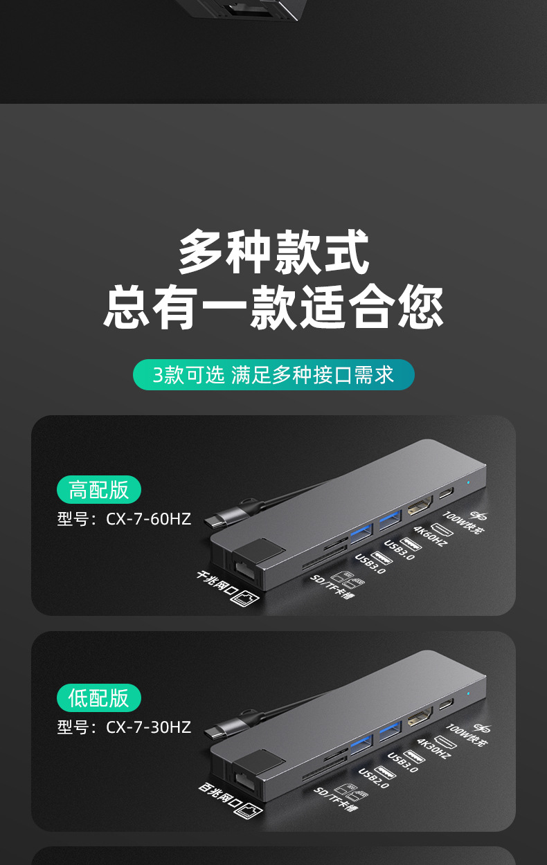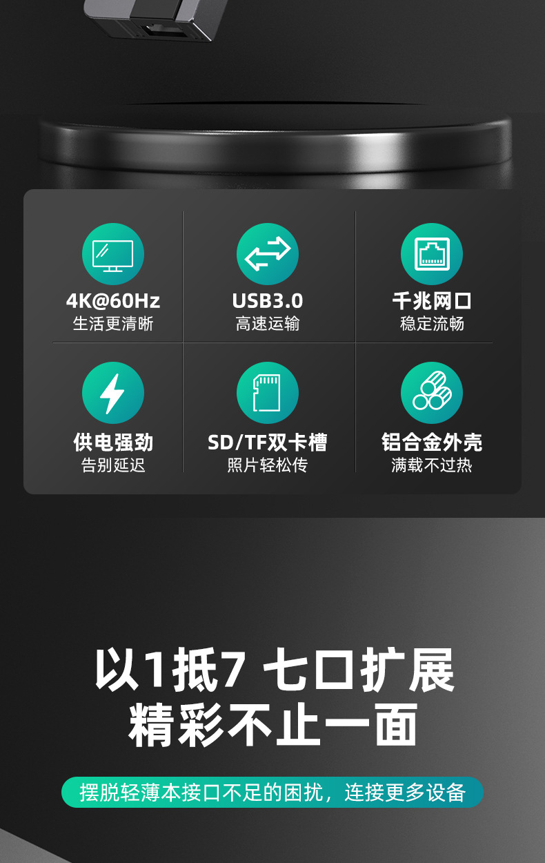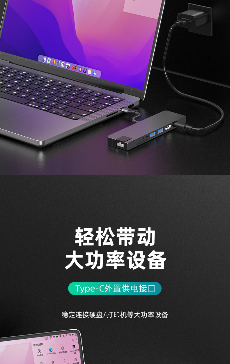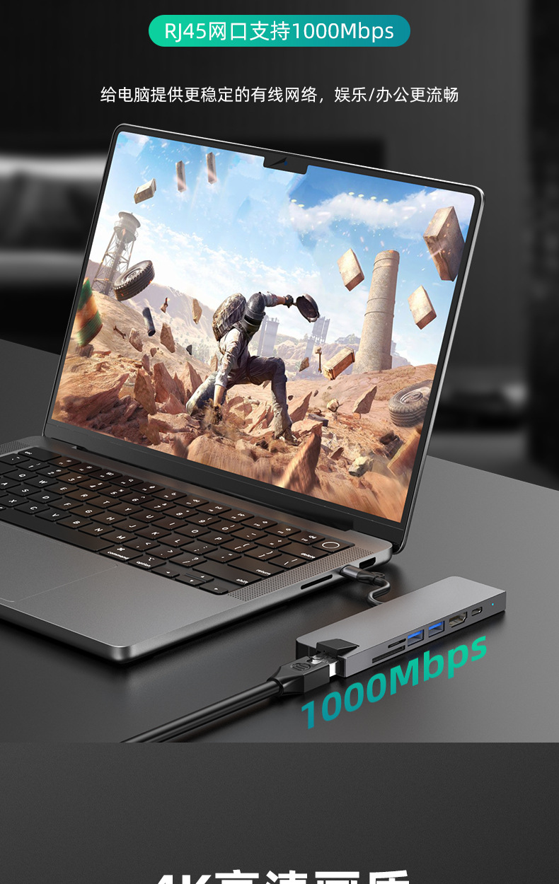 Typec7 하나의 도킹 스테이션 컴퓨터 허브 기가비트 네트워크 카드 PD100 빠른 충전 CNC 조각 알루미늄 합금 쉘