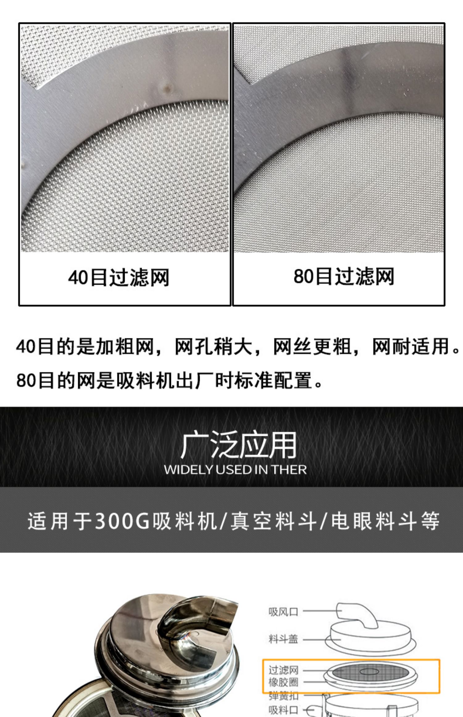 300/800/700G 흡입 기계 필터 공급 기계 스테인레스 스틸 메쉬 고무 링 스크린 사출 성형 기계 호퍼 액세서리스토어 가기