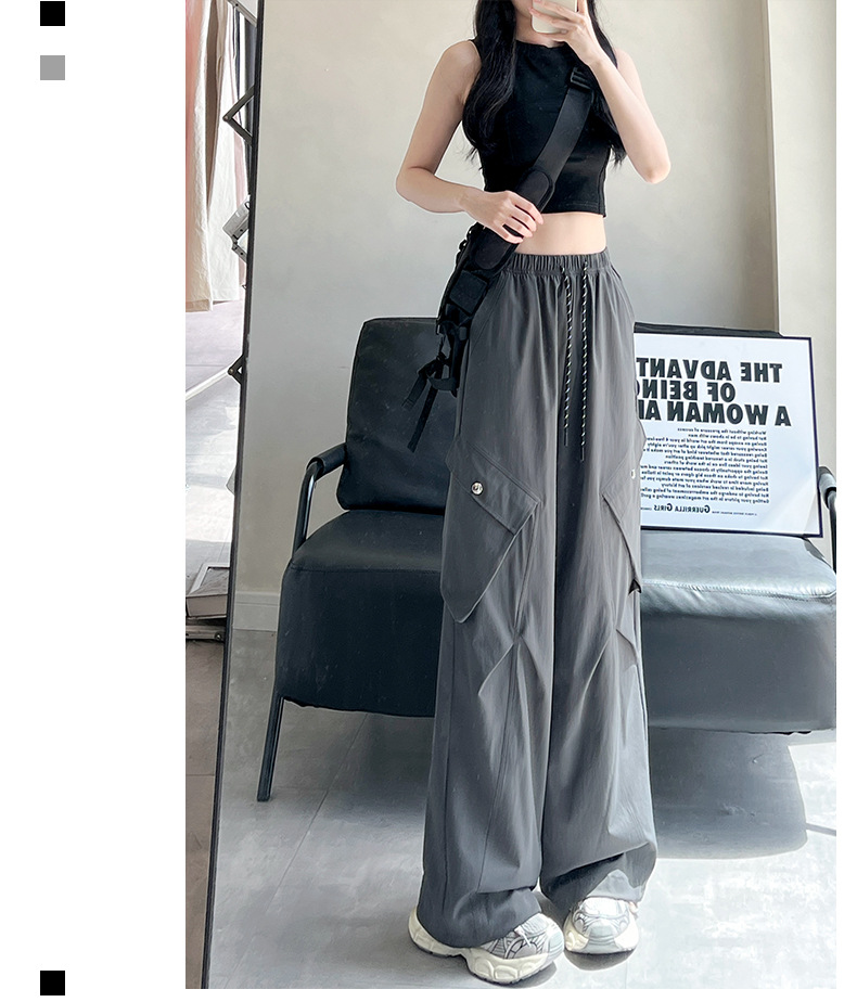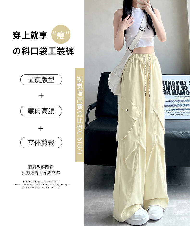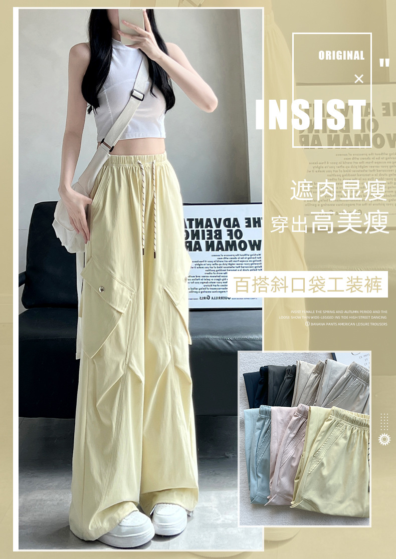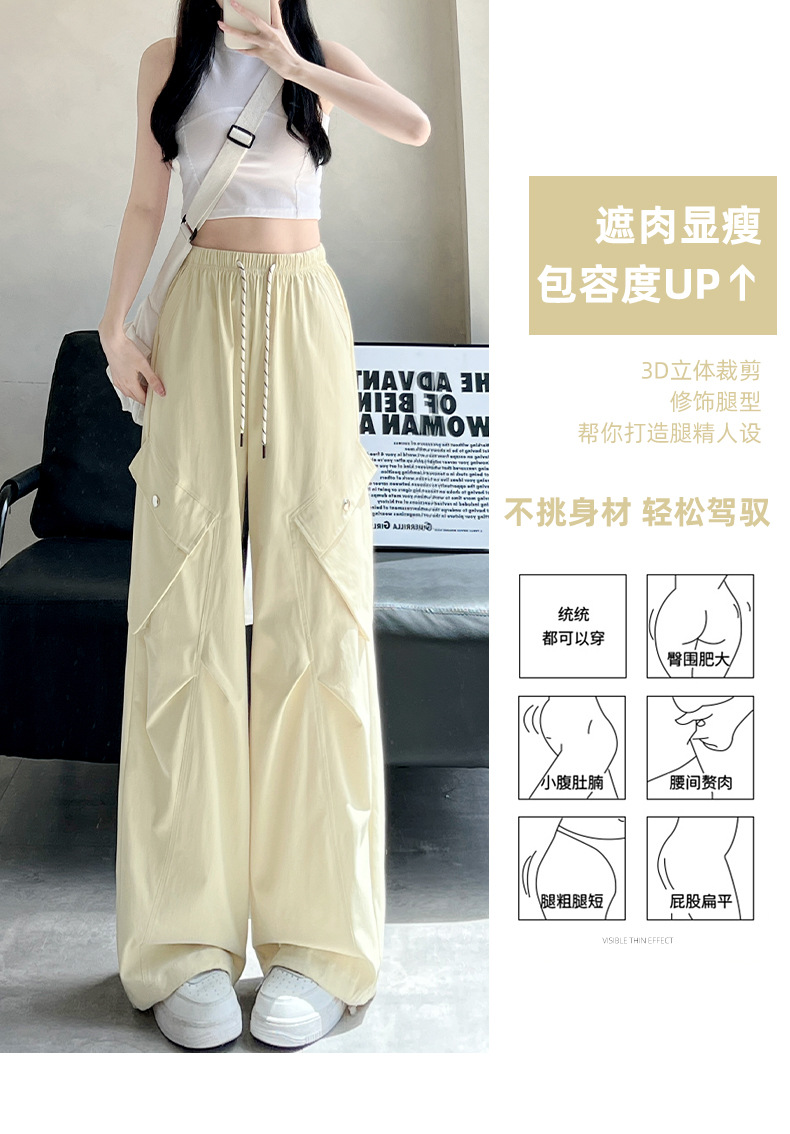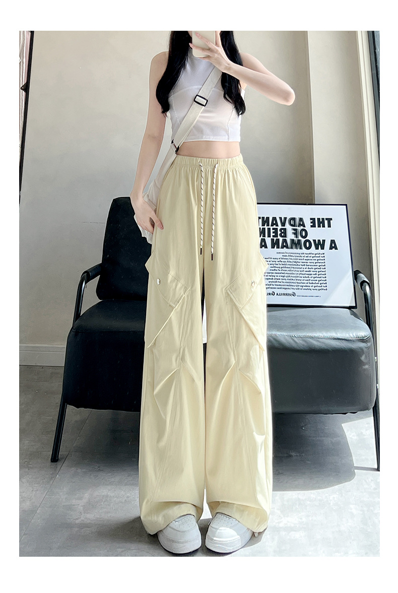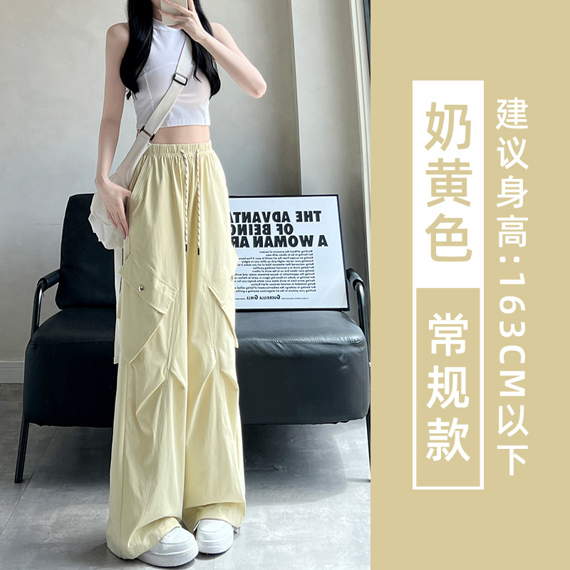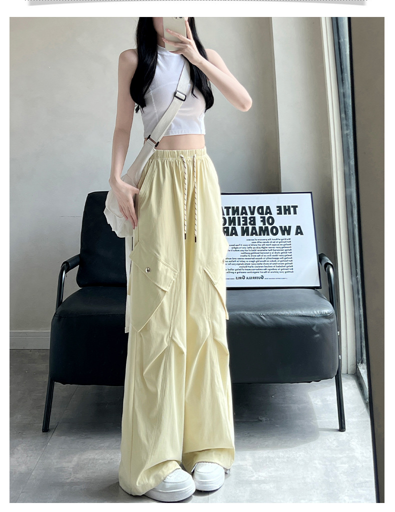 노란색 대형 포켓 오버홀 여성 여름 새로운 높은 허리 슬리밍 느슨한 미국 빠른 건조 스포츠 캐주얼 와이드 레그 바지