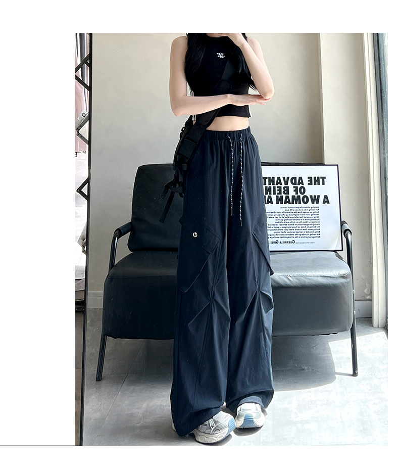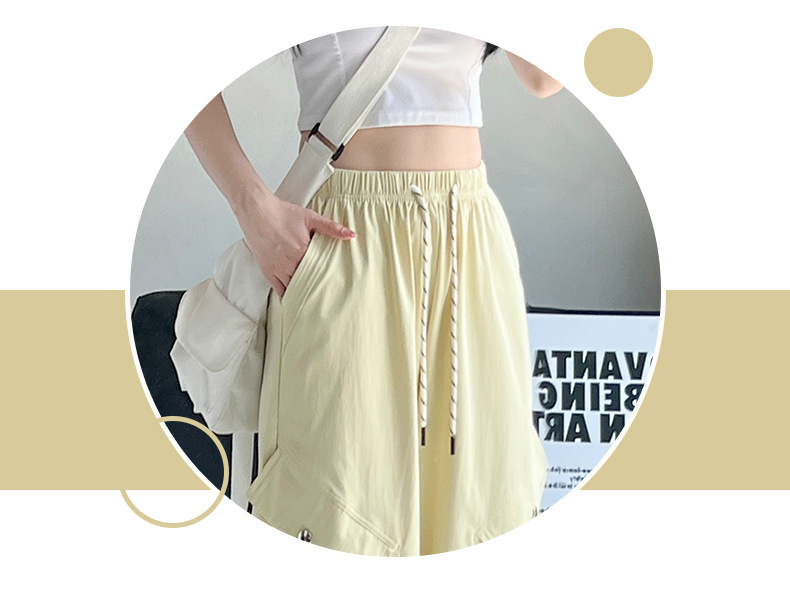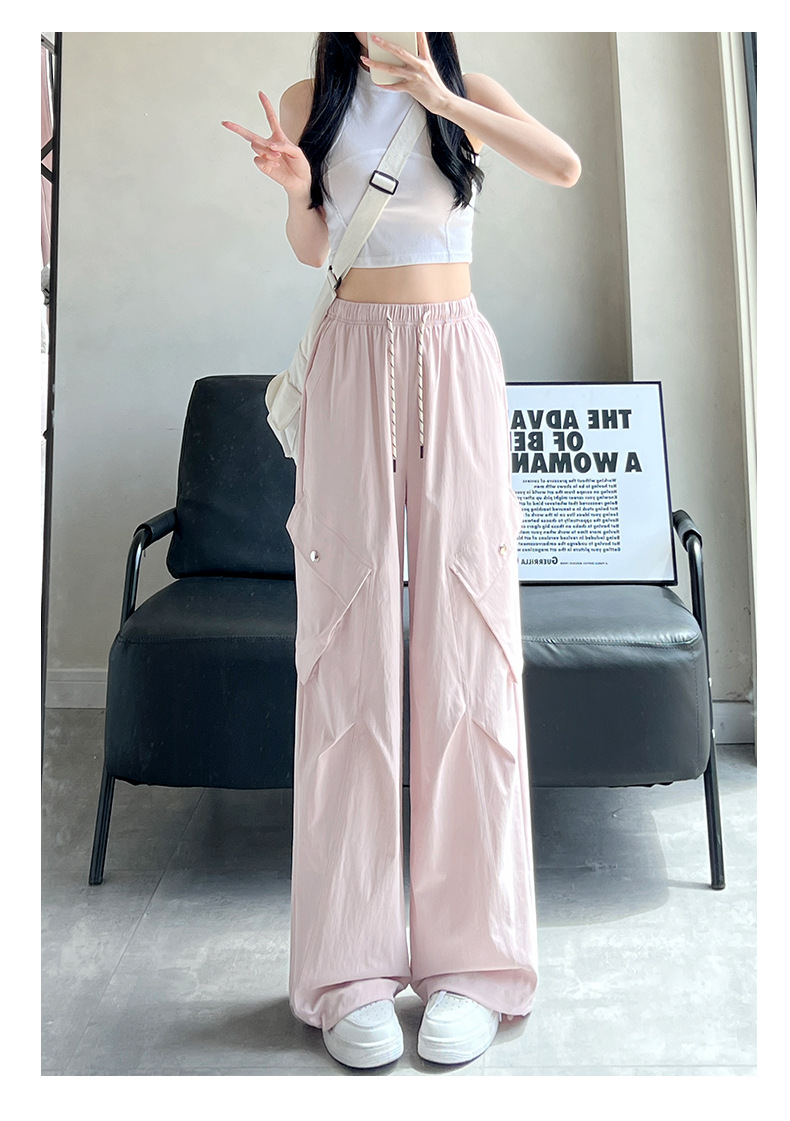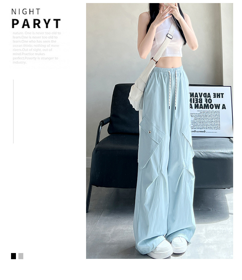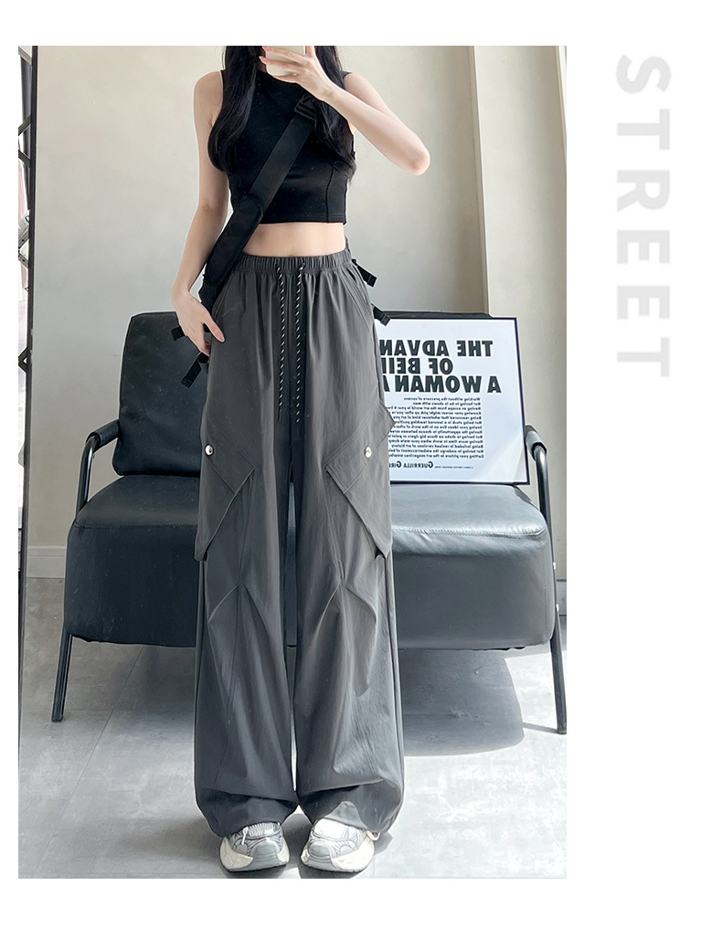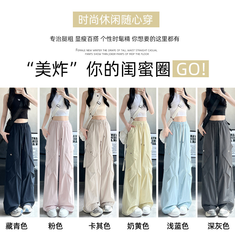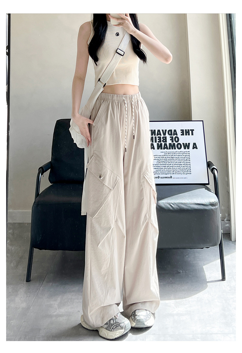 노란색 대형 포켓 오버홀 여성 여름 새로운 높은 허리 슬리밍 느슨한 미국 빠른 건조 스포츠 캐주얼 와이드 레그 바지