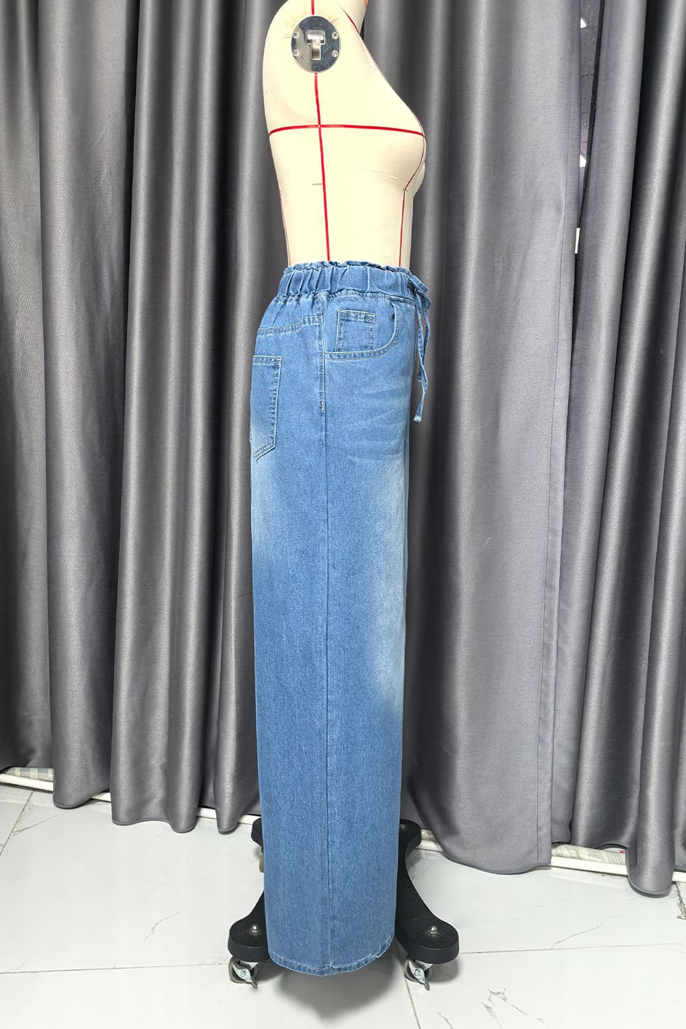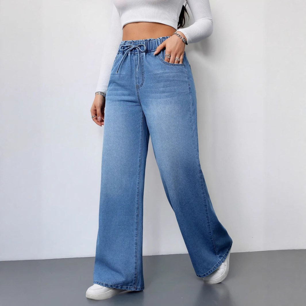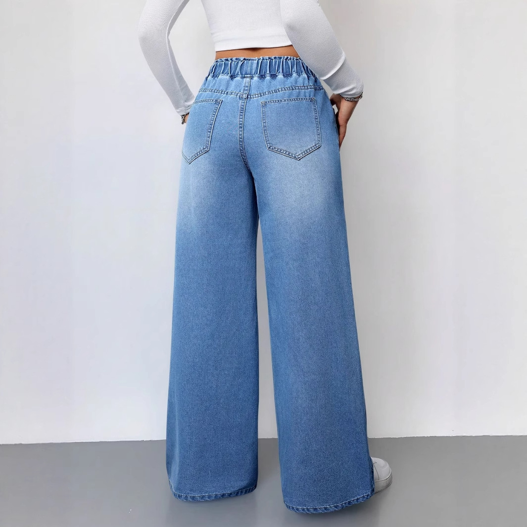 여름 디자인의 여성용 레트로 헤비듀티 라이트 블루 청바지 하이 웨이스트 루즈 스트레이트 신축성 있는 허리 와이드 레그 팬츠스토어 가기