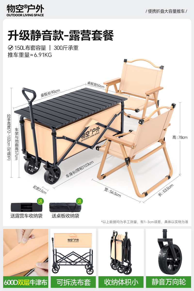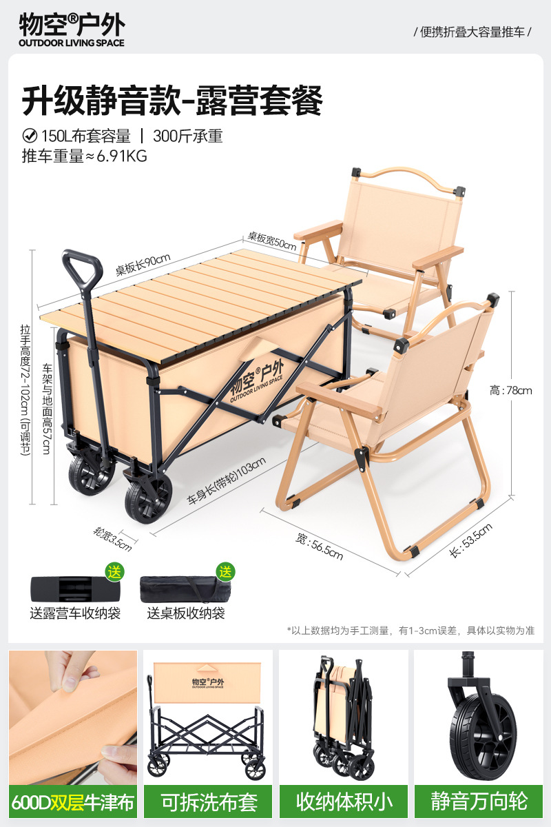 • 캠핑 세트 [특대형 사일런트 휠/고운 샌드 옐로우] + 특대형 및 두꺼워진 올스틸 바디 + 유니버설 휠 + 접이식 카키 테이블