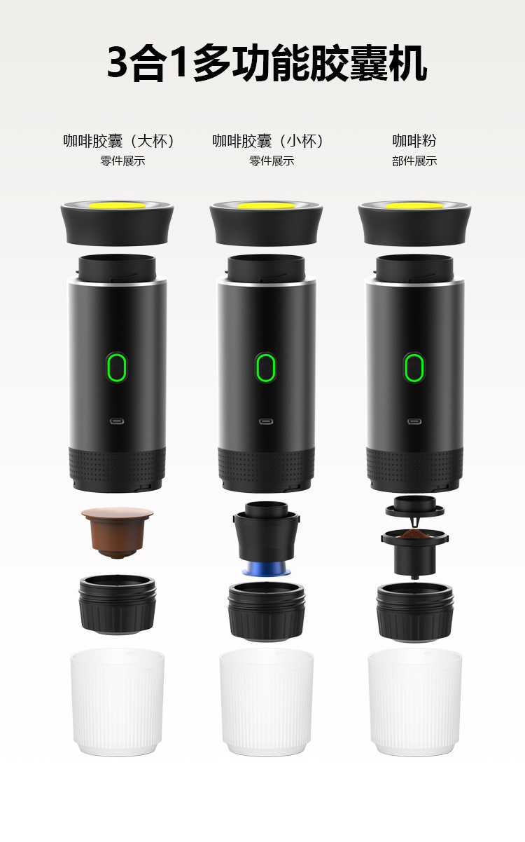 包装清单:胶囊咖啡机+英文说明书+USB充电线+咖啡粉勺+英文彩盒