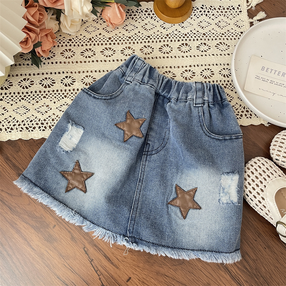 2025 여름 소녀의 오각형 데님 화이트 찢어진 어린이 짧은 치마 유행 스커트 아기 스커트스토어 가기