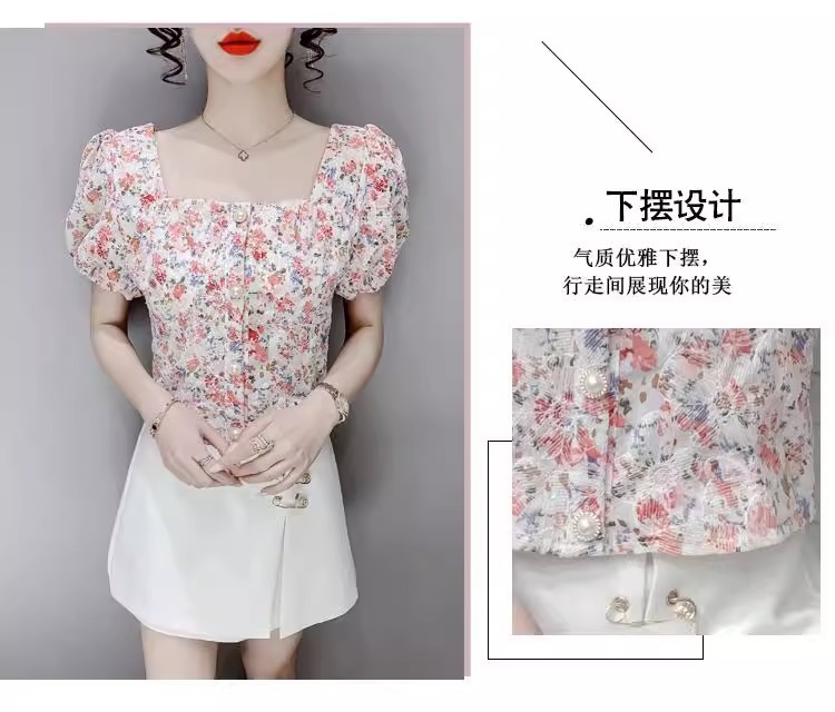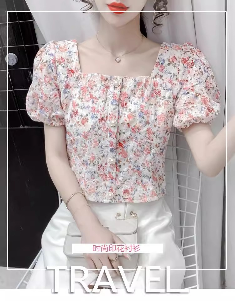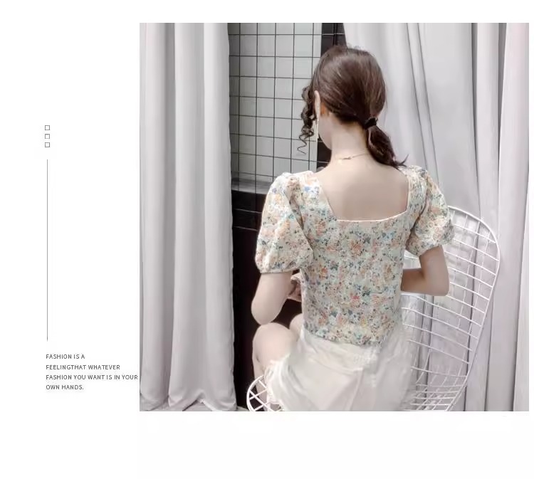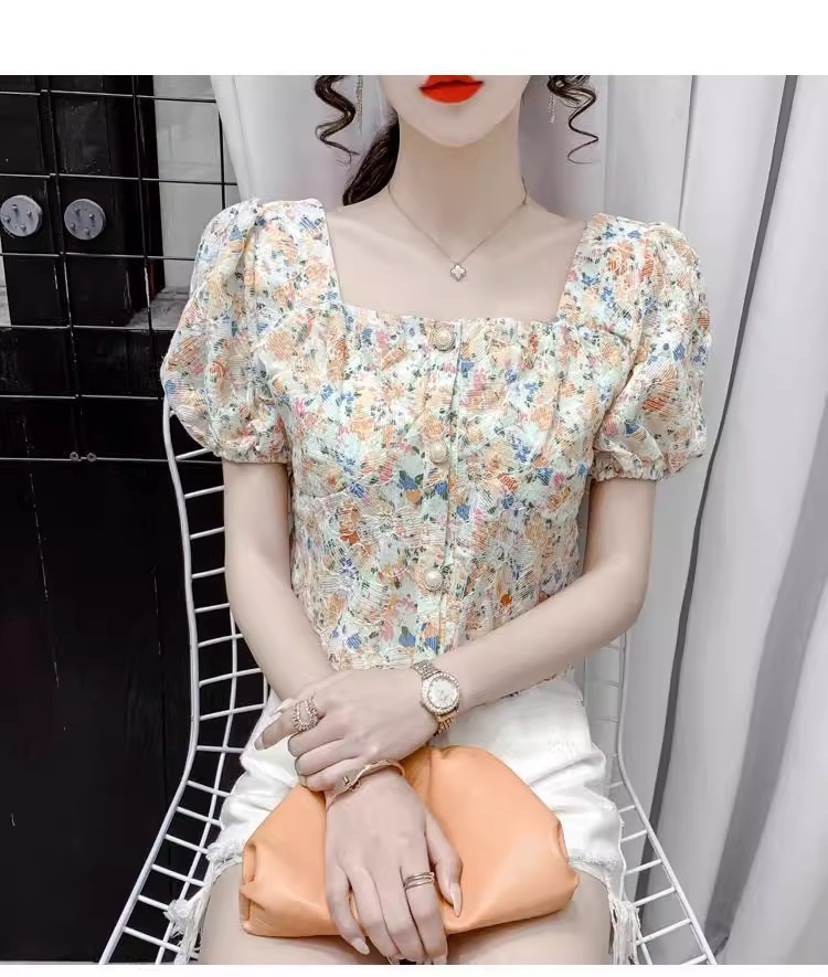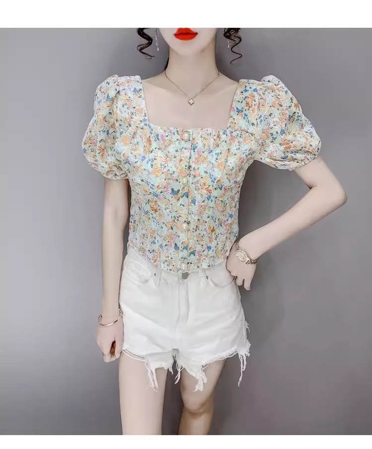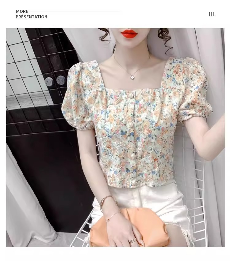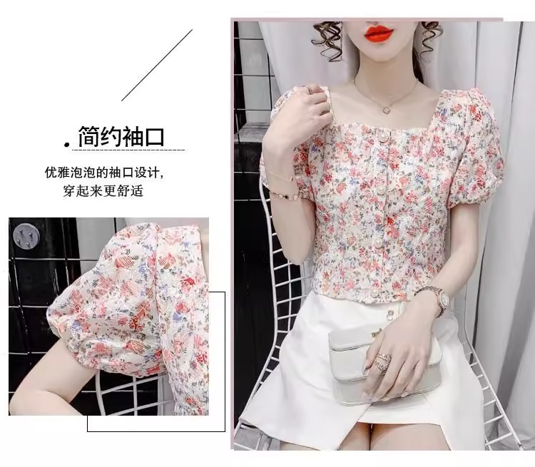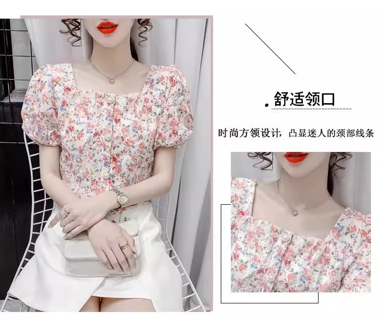 여성을 위한 프렌치 스퀘어 넥 반팔 꽃무늬 쉬폰 셔츠, 니치 여름 신작 퍼프 슬리브 쇼트 탑, 달콤함스토어 가기