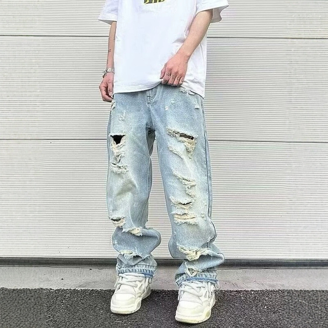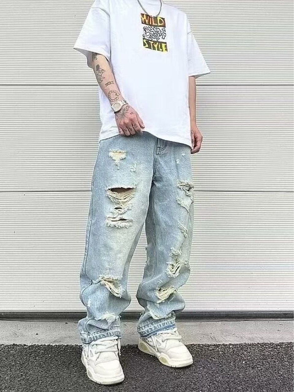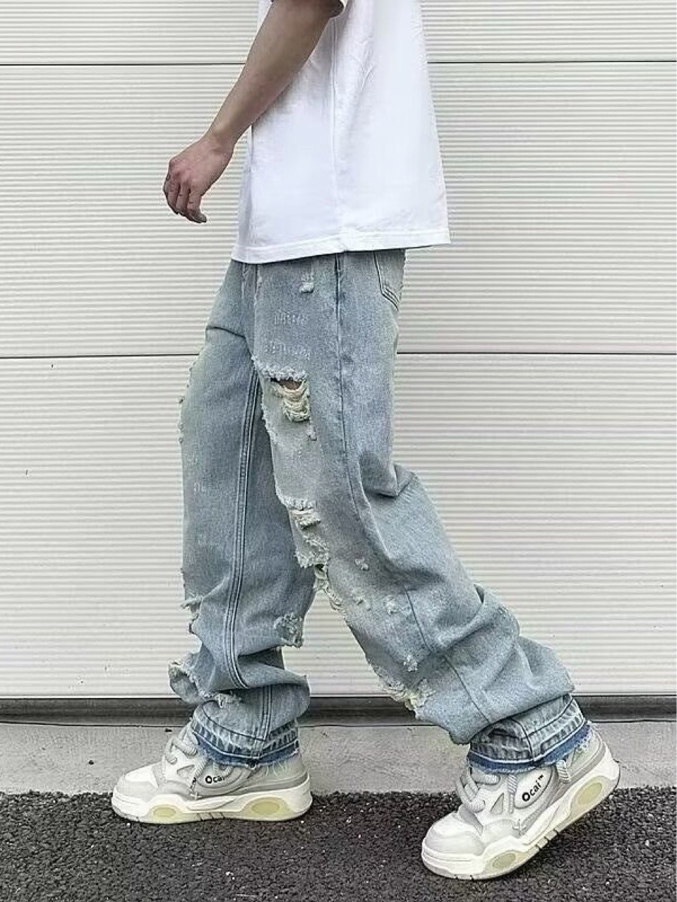 아메리칸 바이브 스타일 팬츠, 하이 스트리트 트렌디 브랜드 디자인, 워싱 찢어진 청바지, 남성용 레트로 스트리트 와이드 팬츠
