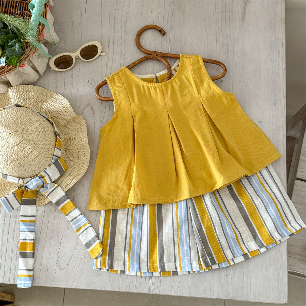 [모자 보내기!]] 한국 어린이 착용 아기 소녀 휴가 스타일 귀여운 인형 셔츠 줄무늬 바지 세련된 유행 세트