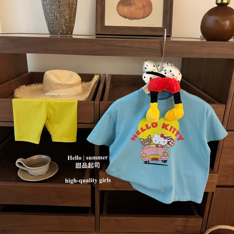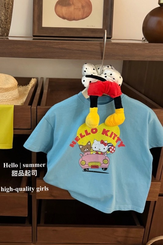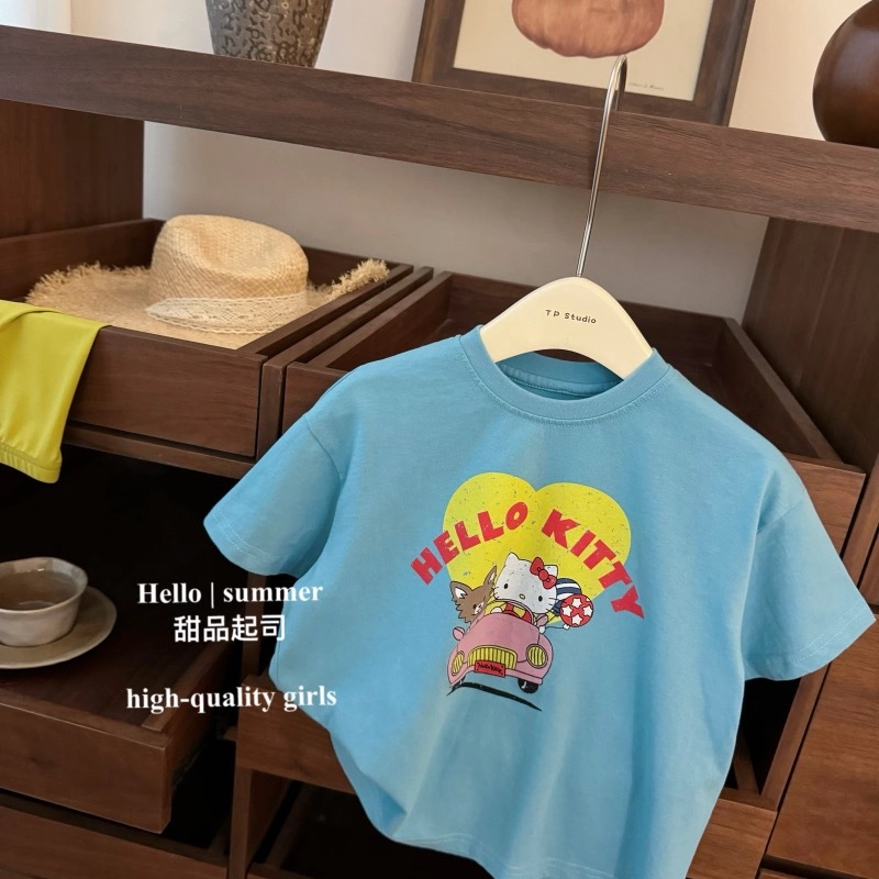여름 새로운 핫 걸스 KT 만화 프린트 티셔츠 어린이 유행 서양식 편안한 반소매 반소매 탑스토어 가기