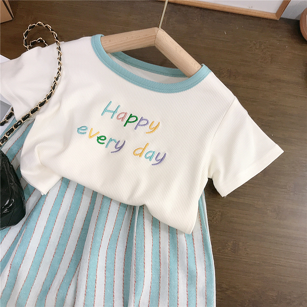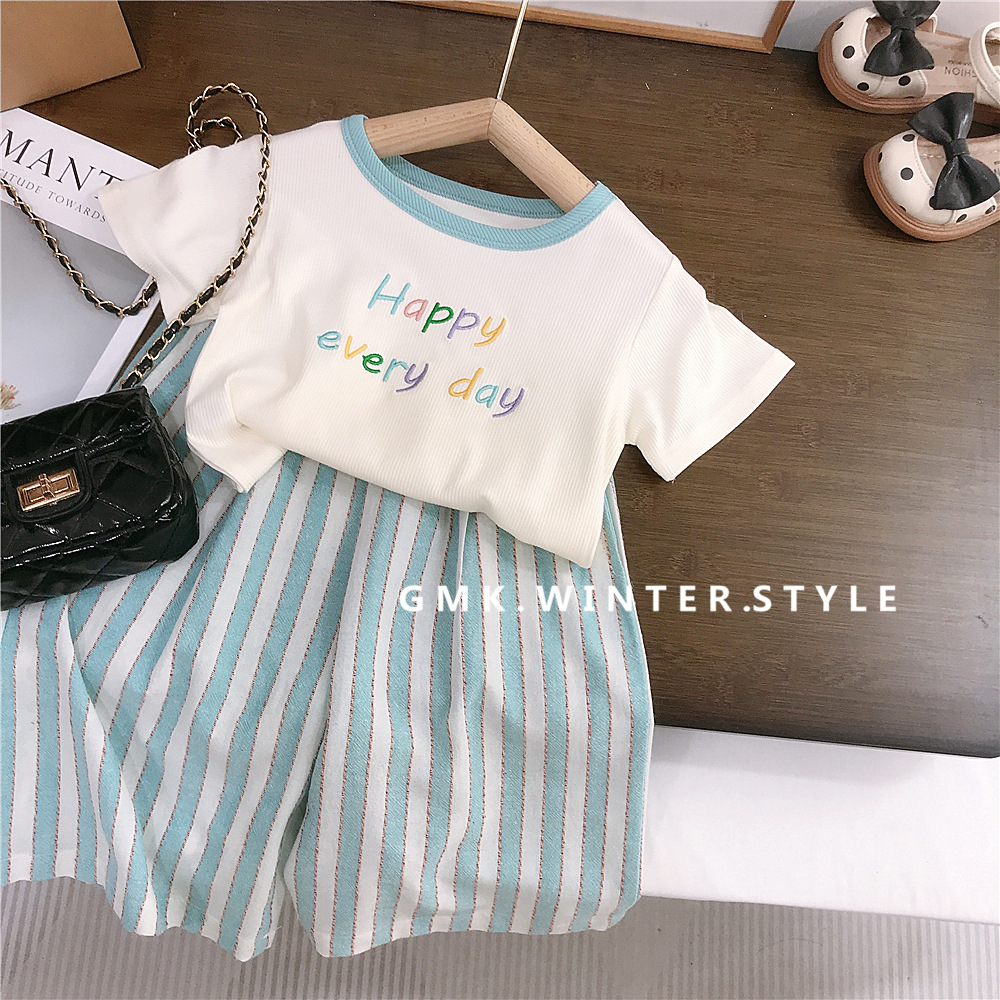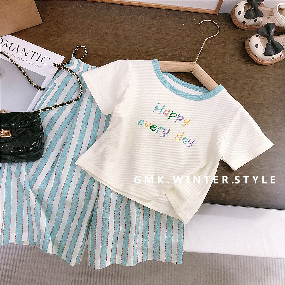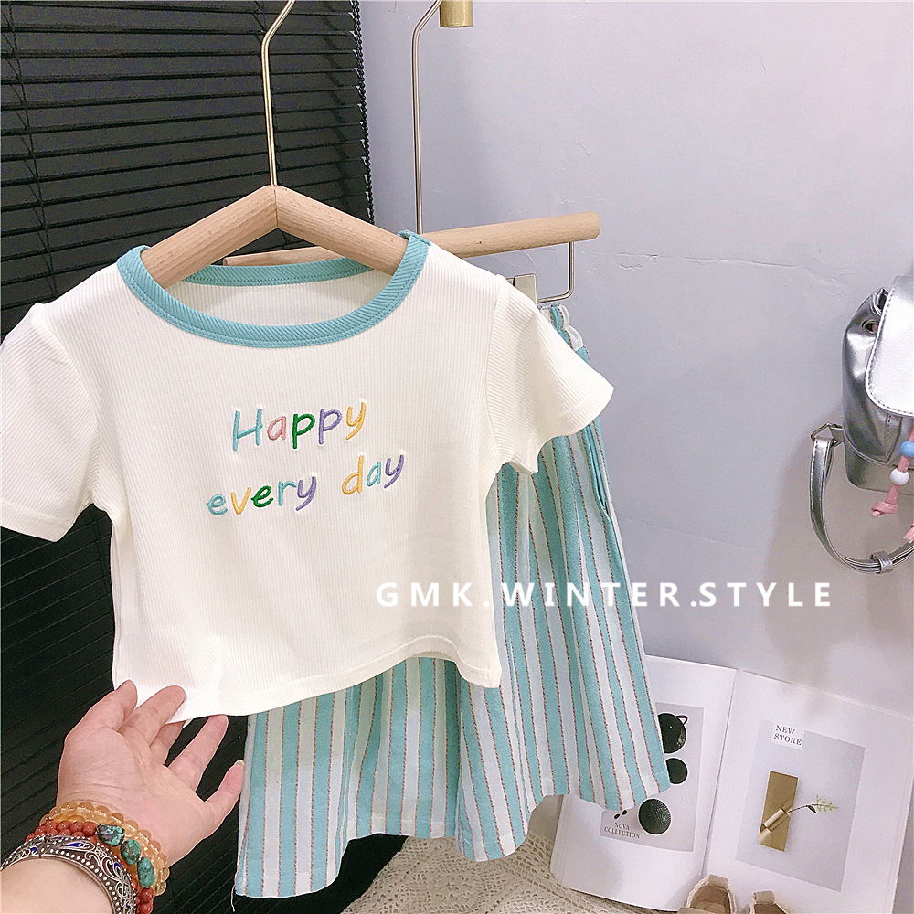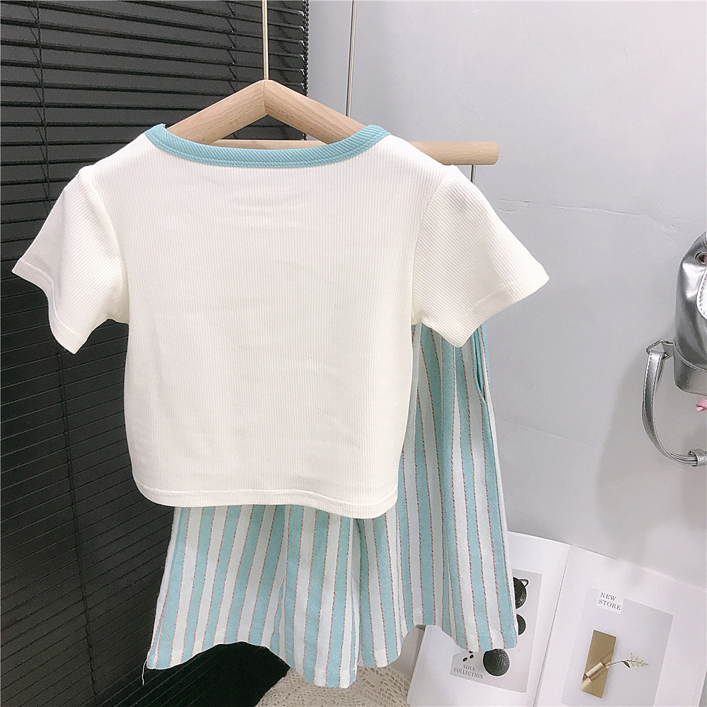 여아 반팔 양복 여름 새로운 스타일 유행 아동복 아기 소녀 줄무늬 넓은 다리 바지 투피스 세트 대외 무역스토어 가기