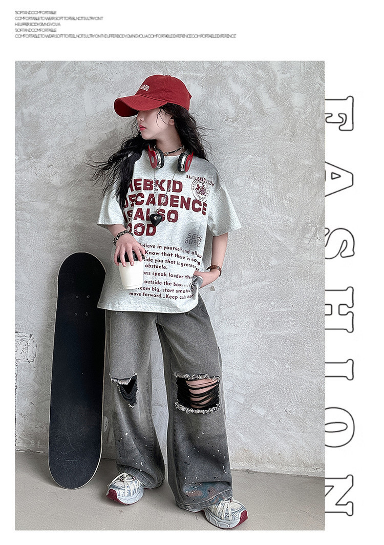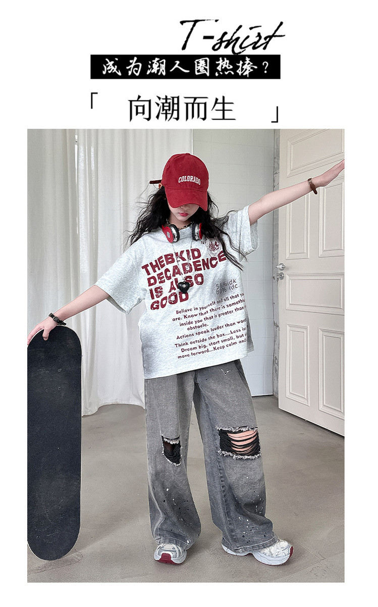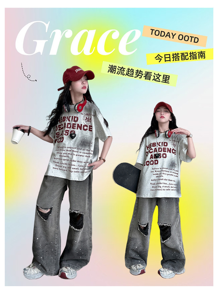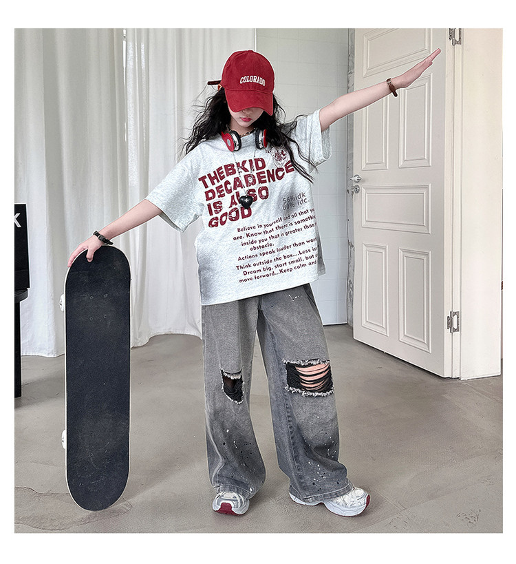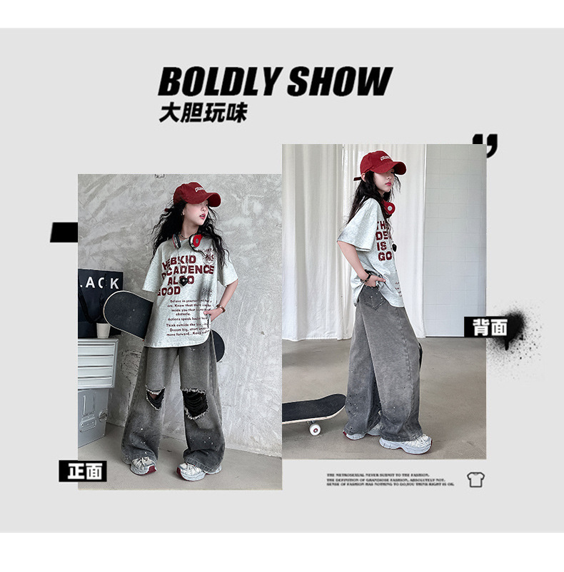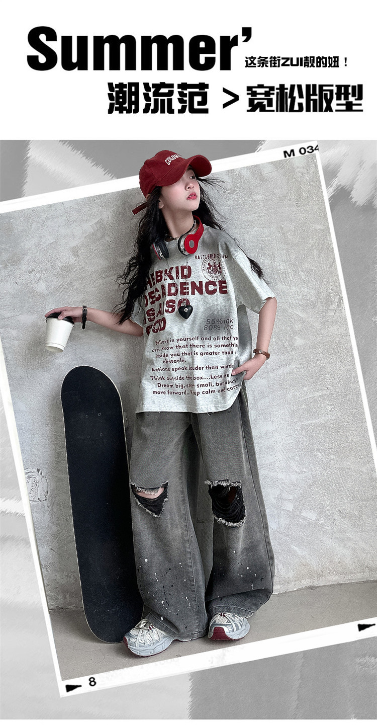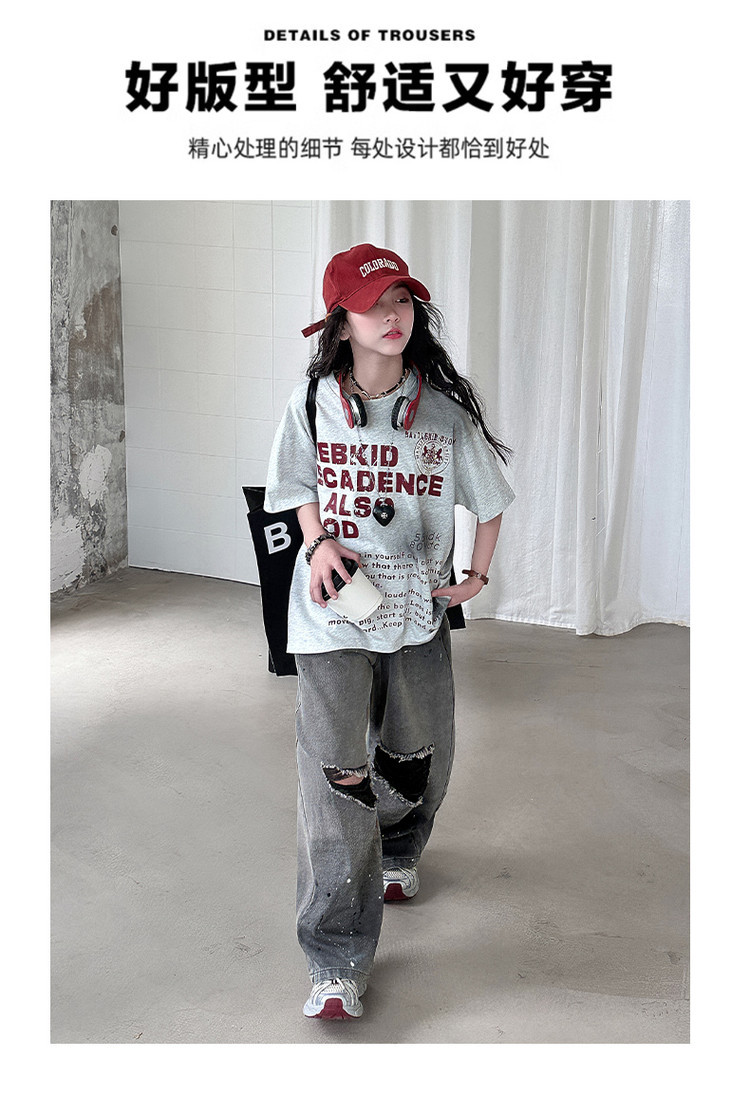 여자 여름 찢어진 청바지 정장 2025 새로운 어린이 느슨한 반팔 티셔츠 스트레이트 바지 투피스 유행 세트스토어 가기