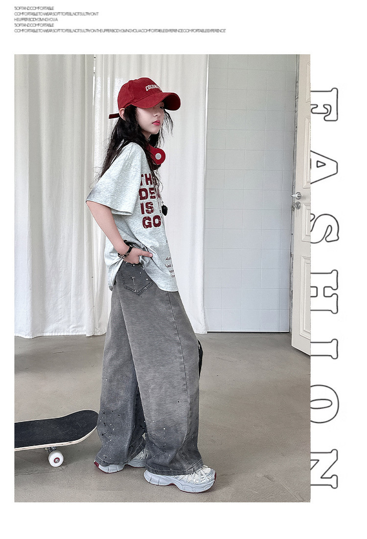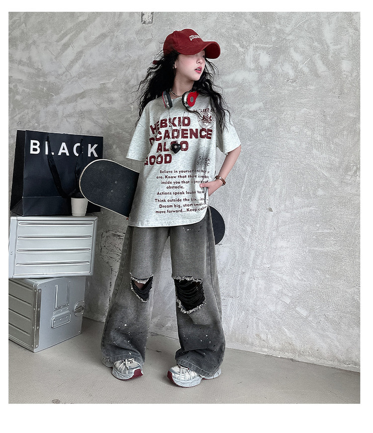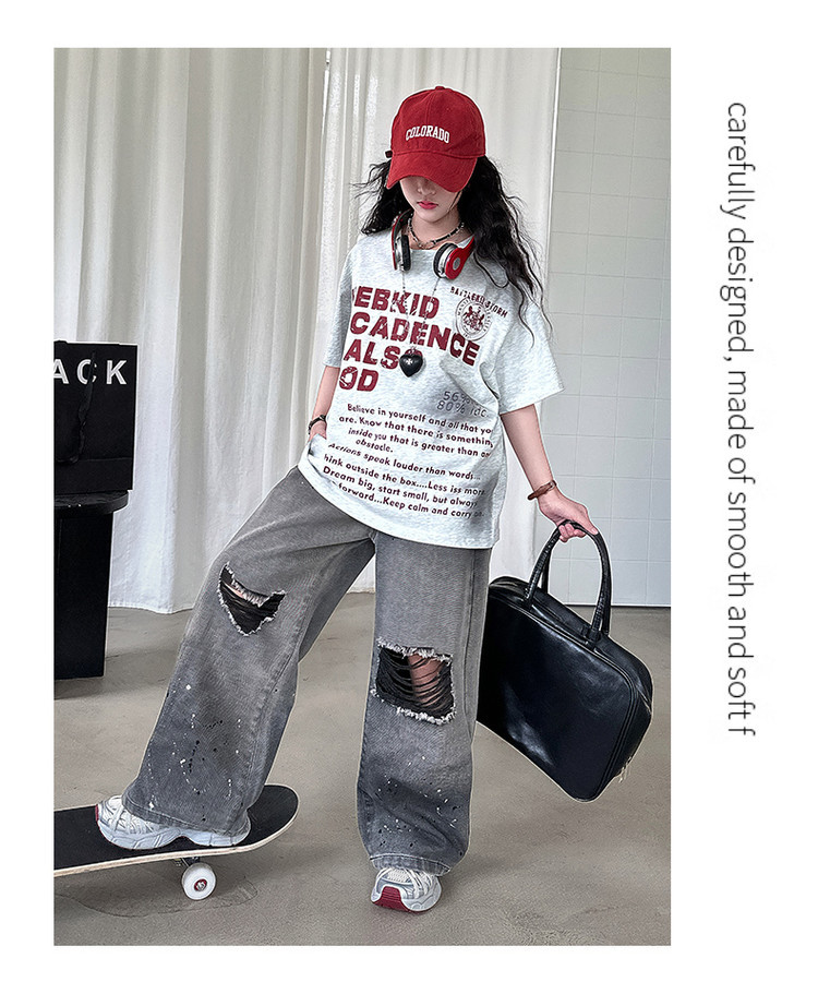 여자 여름 찢어진 청바지 정장 2025 새로운 어린이 느슨한 반팔 티셔츠 스트레이트 바지 투피스 유행 세트