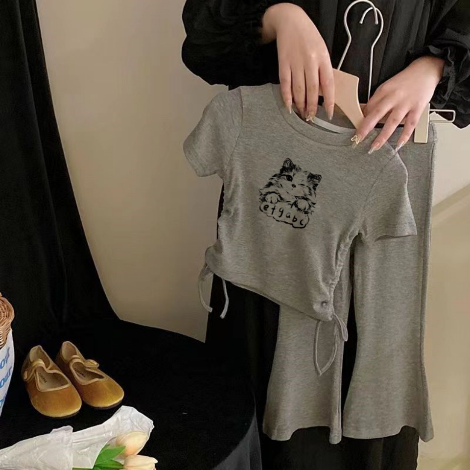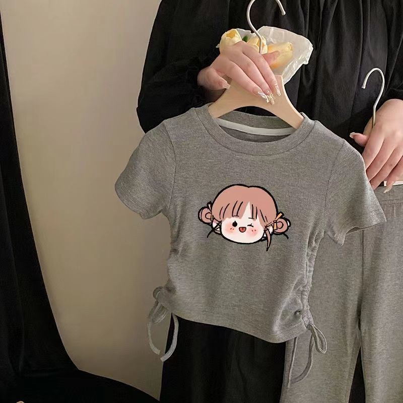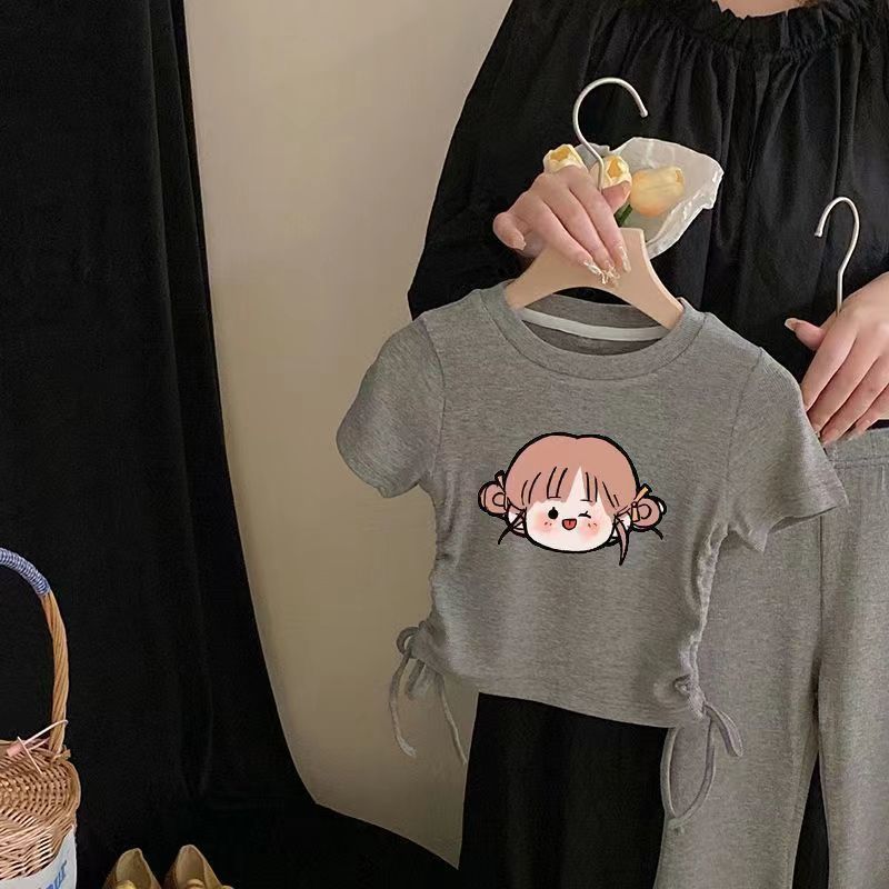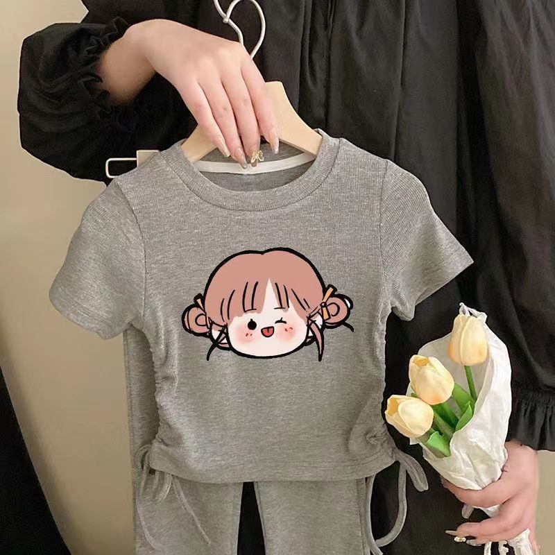 여름 여성 아동복 반팔 소녀 2024 폭발 세트 캐주얼 탑 벨 바지 아기 투피스 의상스토어 가기