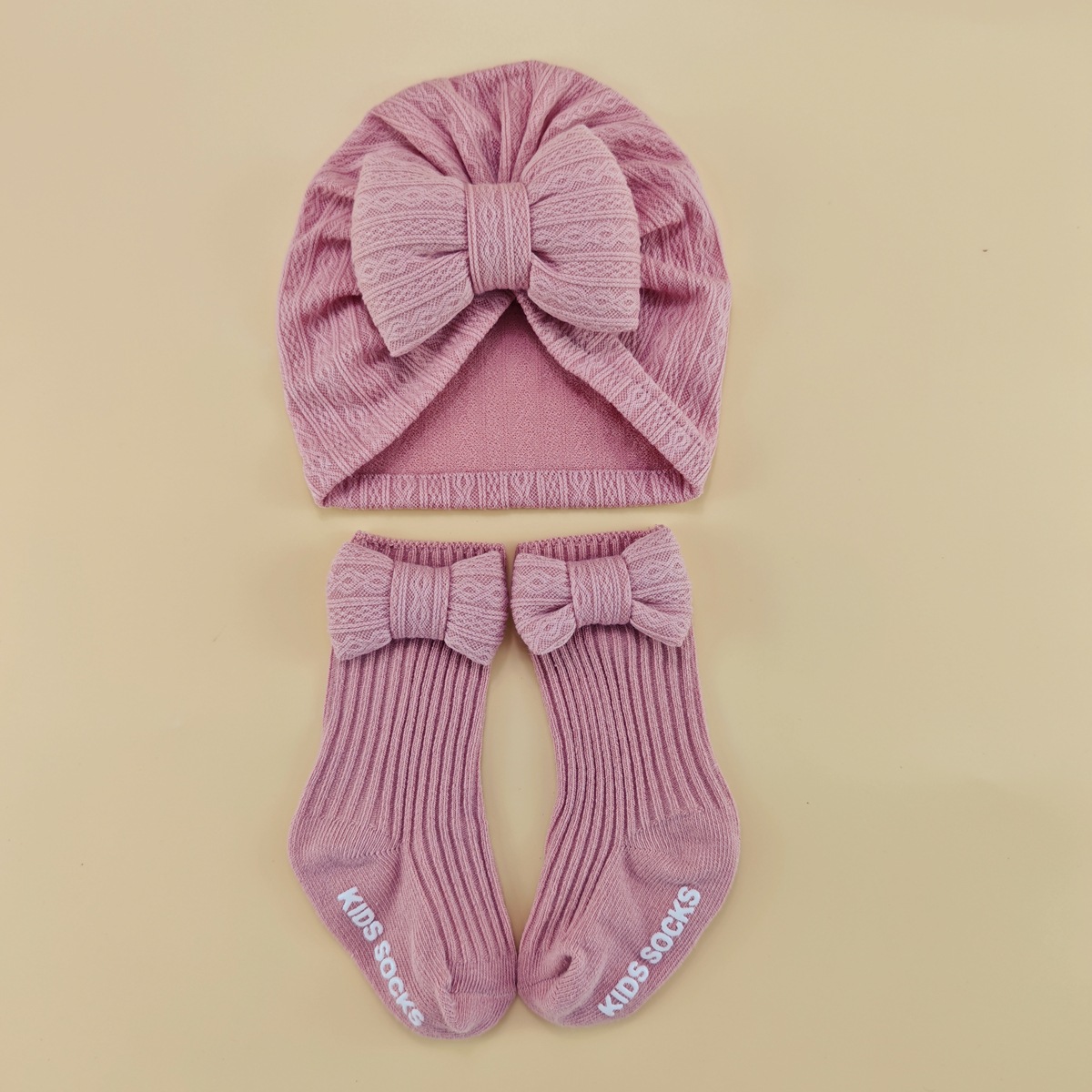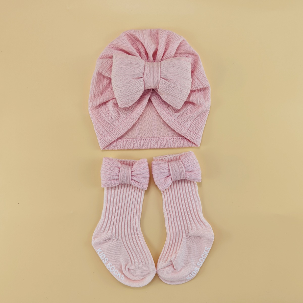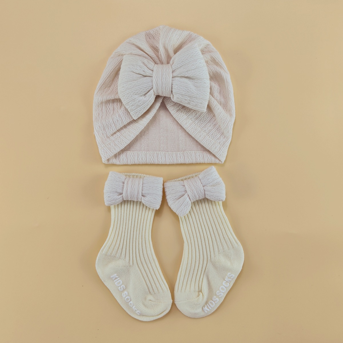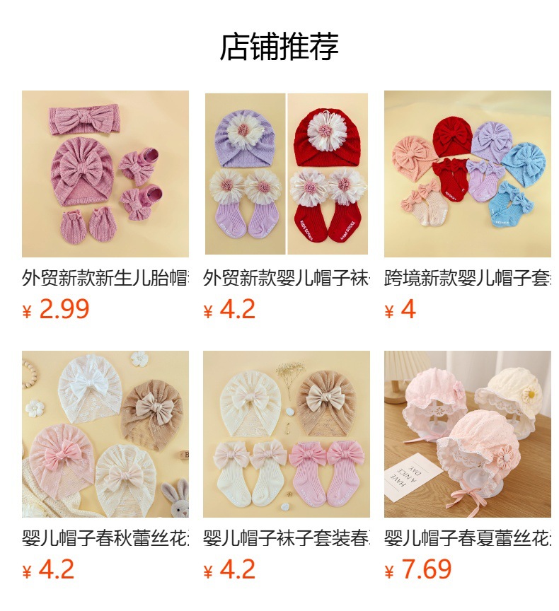 春夏新款婴儿帽子袜子套装新生儿胎帽宝宝可爱蝴蝶结帽纯色婴儿帽