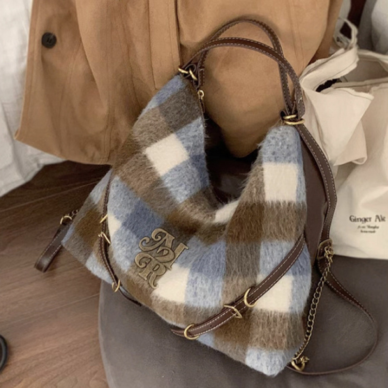 • 여성을위한 레트로 프레피 스타일 배낭 가을, 겨울 2024 새로운 유행 모직 격자 무늬 토트 백 다목적 대용량 가방