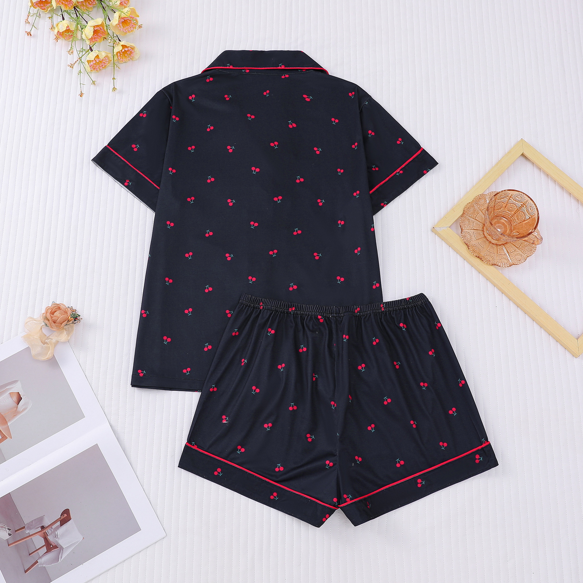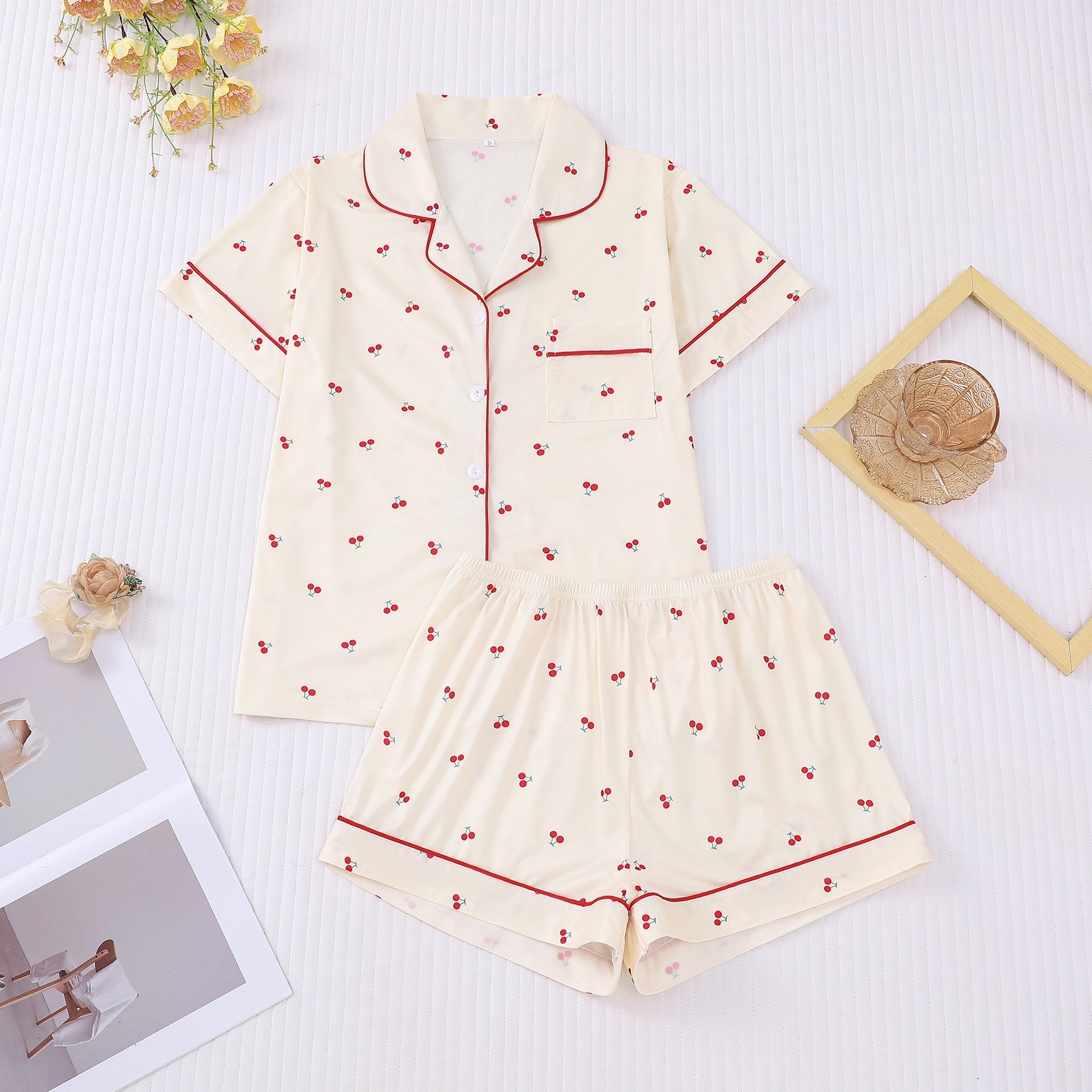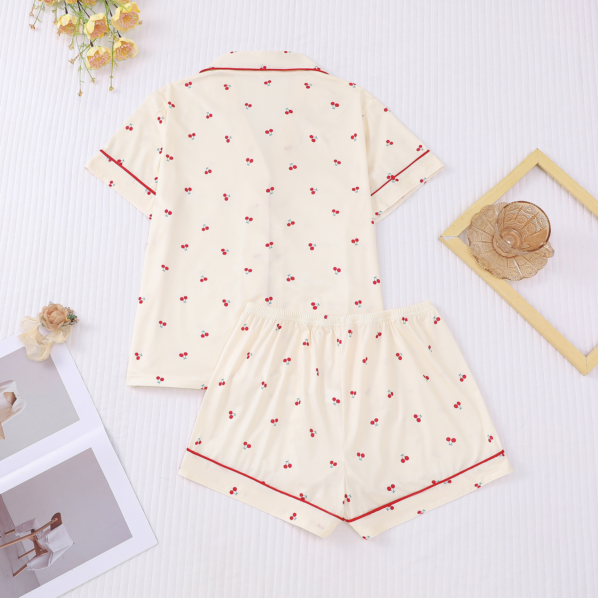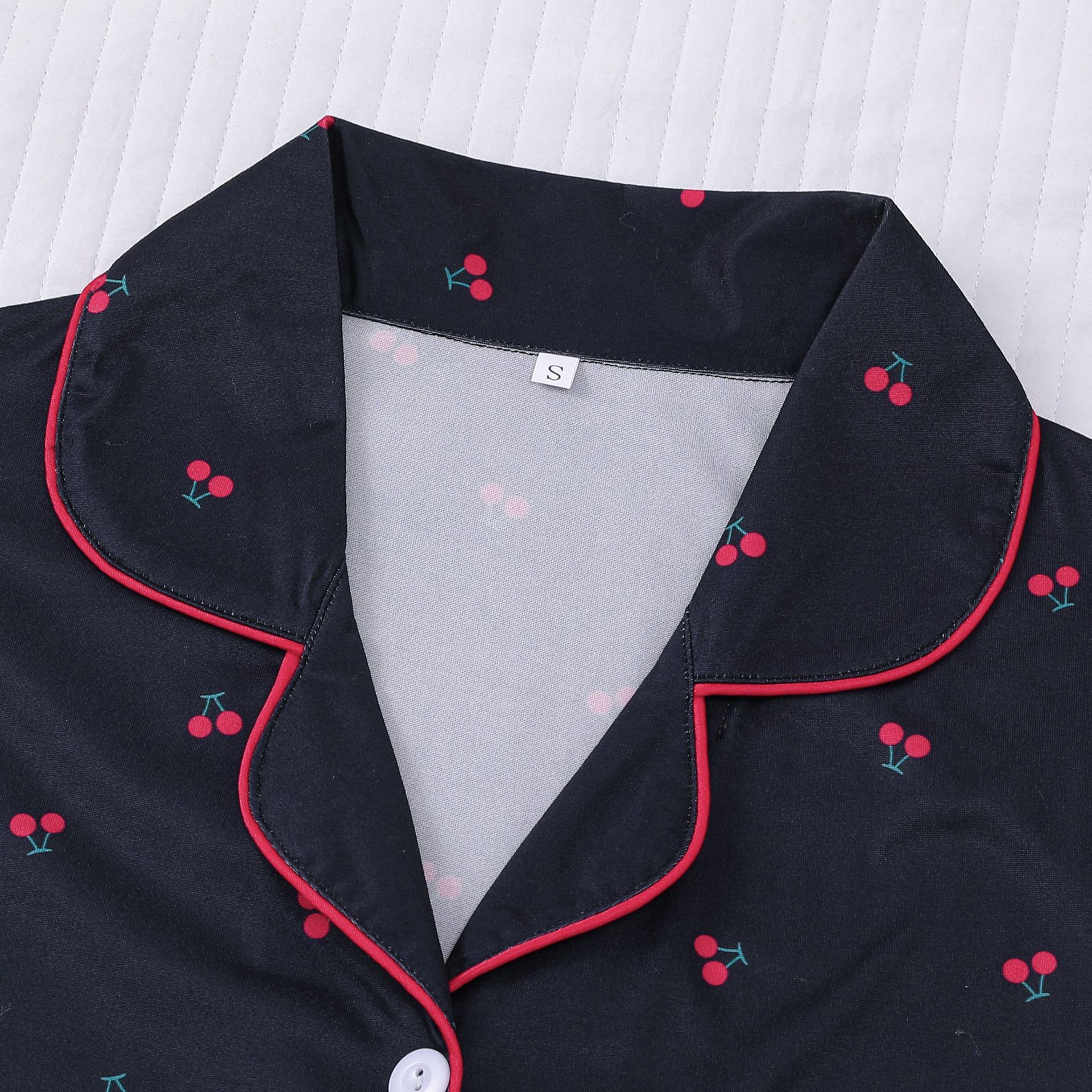 국경 간 대외 무역 새로운 유럽과 미국 여성 잠옷 체리 프린트 라펠 반팔 반바지 유럽과 미국의 홈웨어 세트