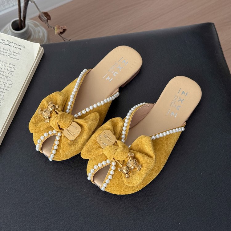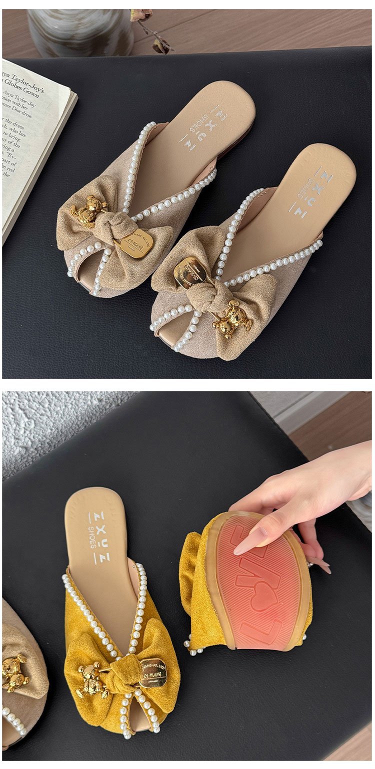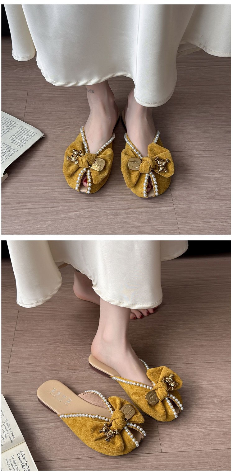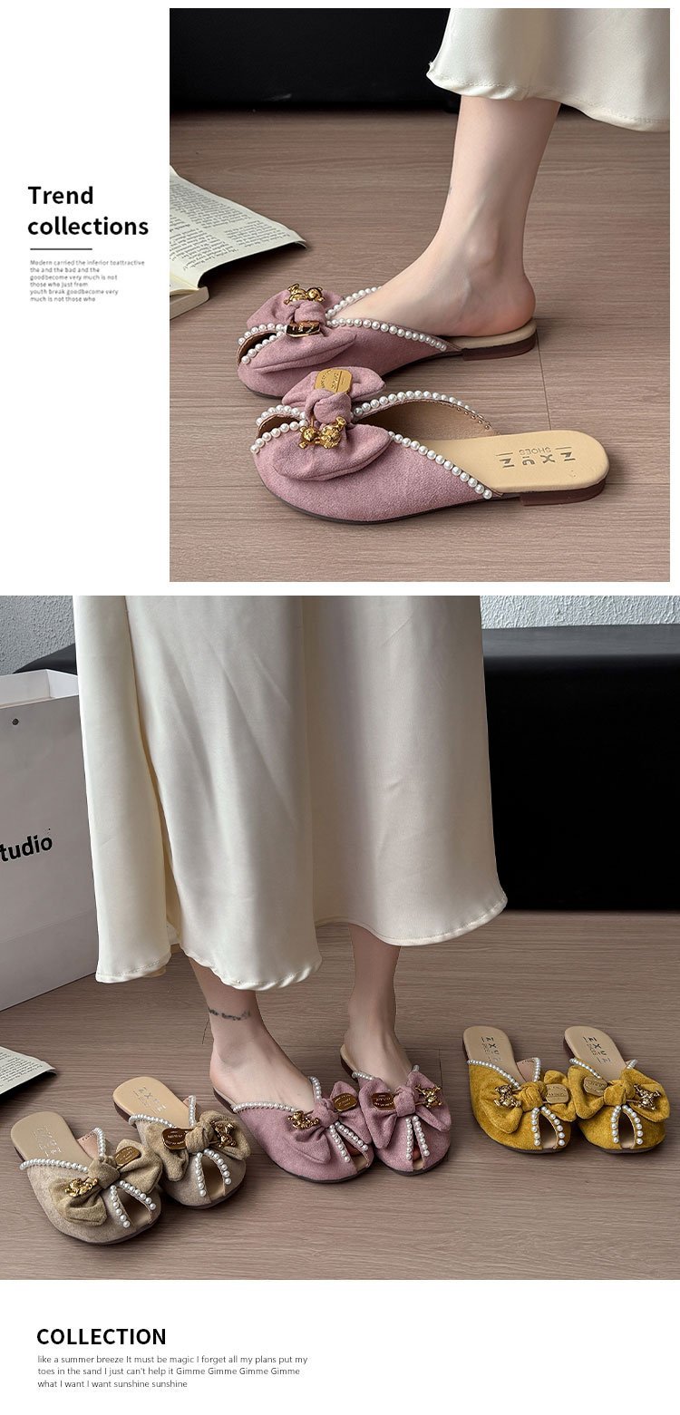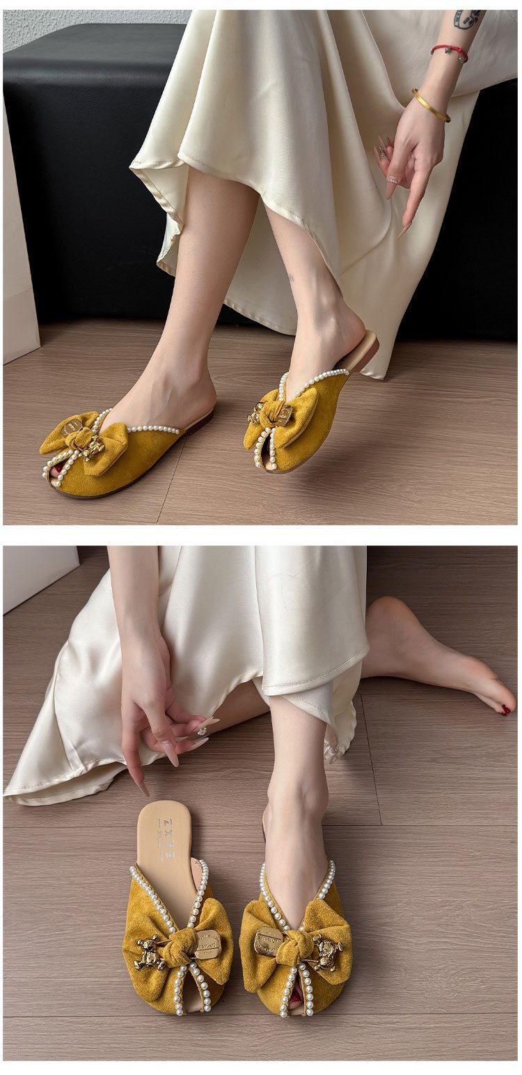 인터넷 연예인 진주 플랫 통기성 하프 슬리퍼 유행 여성 겉옷 2025 여름 새로운 패션 나비 매듭 발가락 샌들
