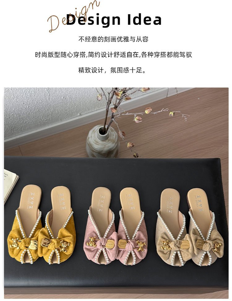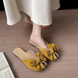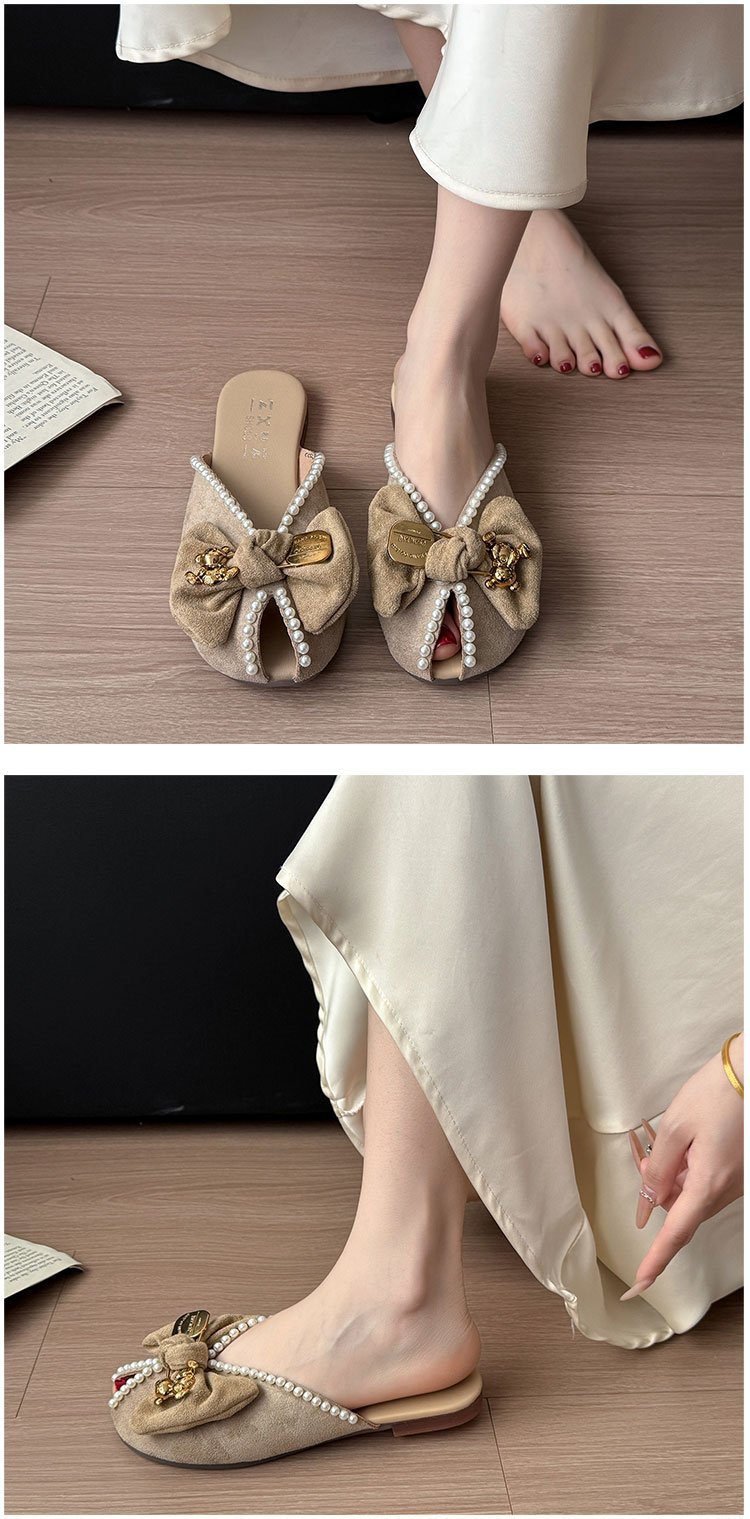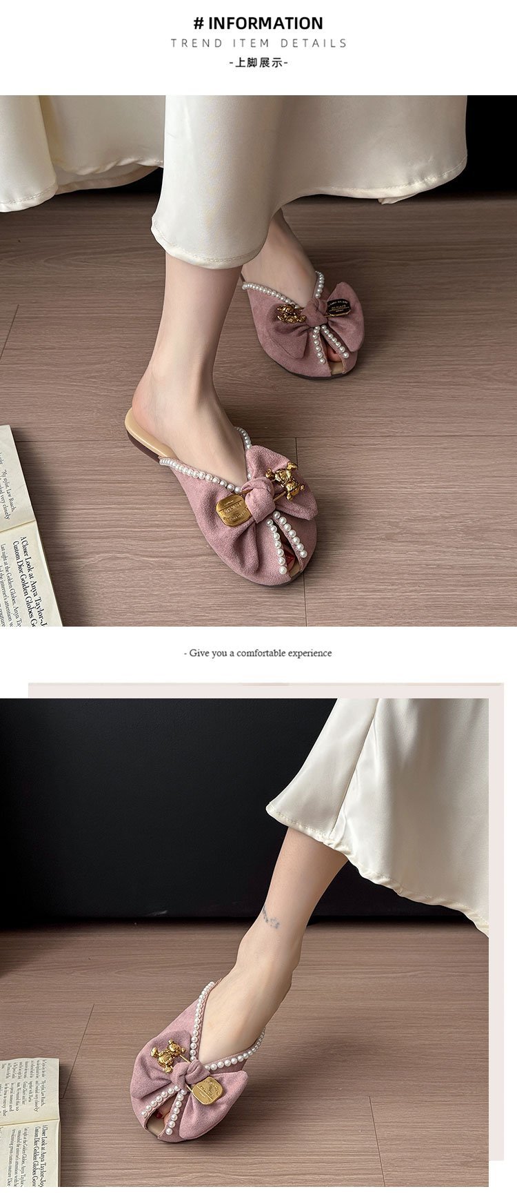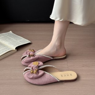 인터넷 연예인 진주 플랫 통기성 하프 슬리퍼 유행 여성 겉옷 2025 여름 새로운 패션 나비 매듭 발가락 샌들스토어 가기