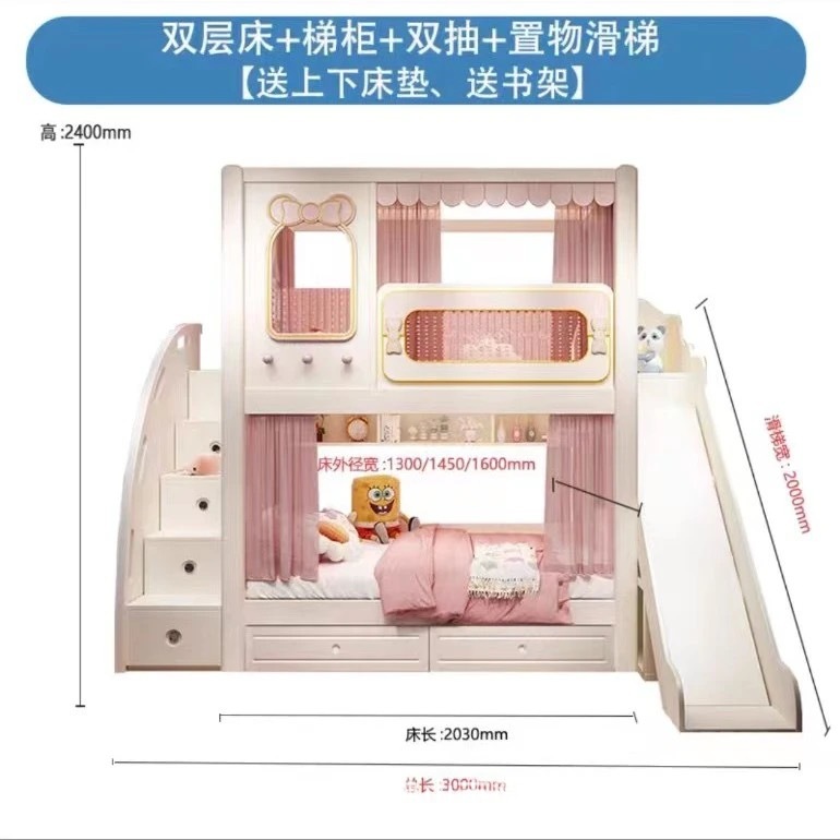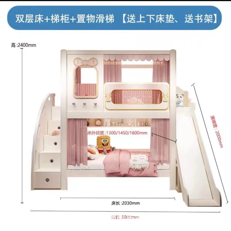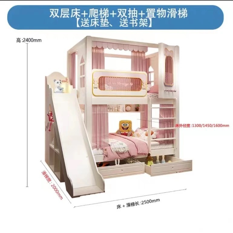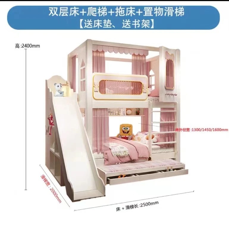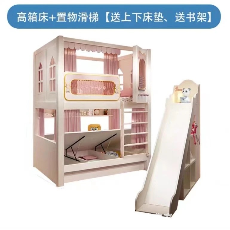어린이 이층침대, 성슬라이드침대, 다기능 이층침대, 핑크색 높은 가드레일, 어린이 이층침대, 위아래 너비 동일