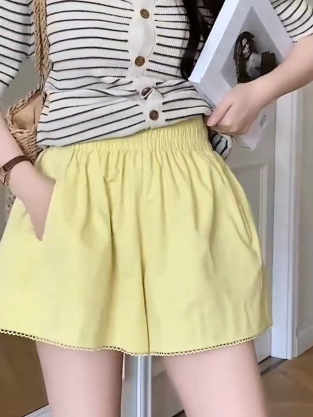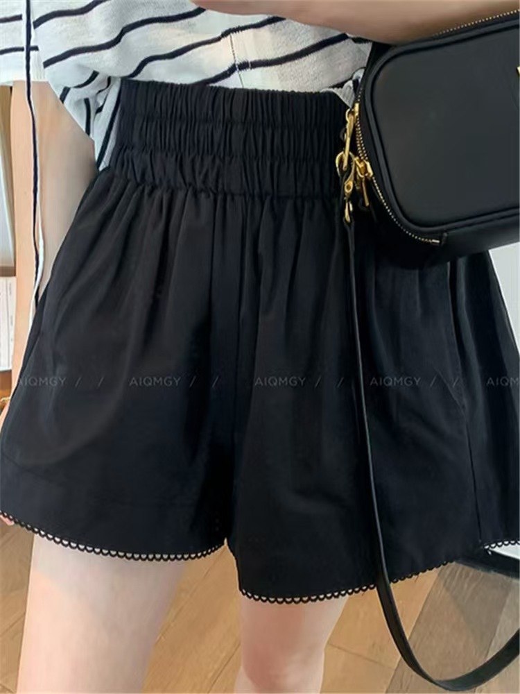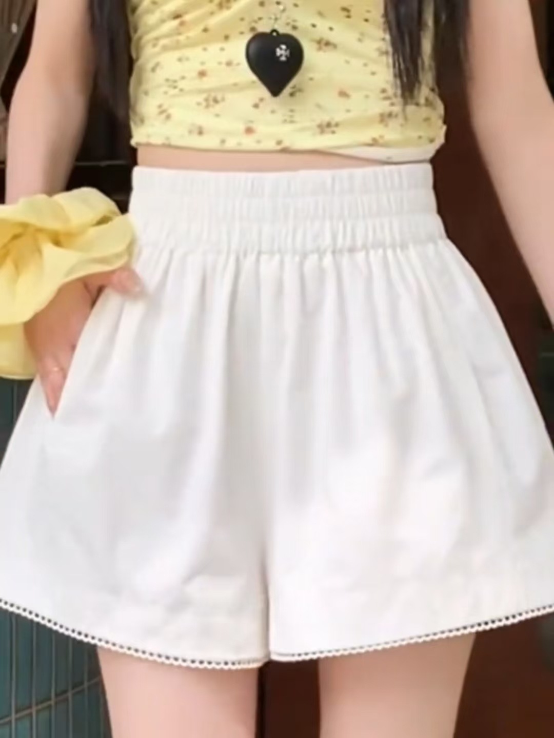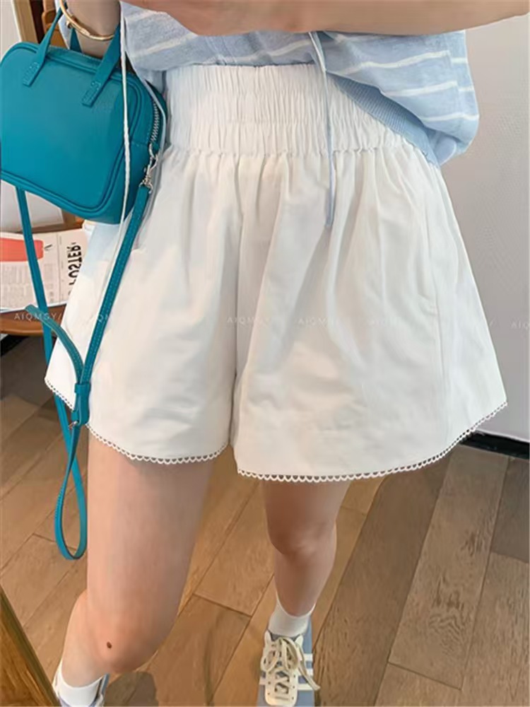 2025 여름 새로운 흰색 탄성 허리 레이스 반바지 여성의 높은 허리 슬리밍 넓은 다리 바지 올 매치 캐주얼 핫팬츠 패션스토어 가기