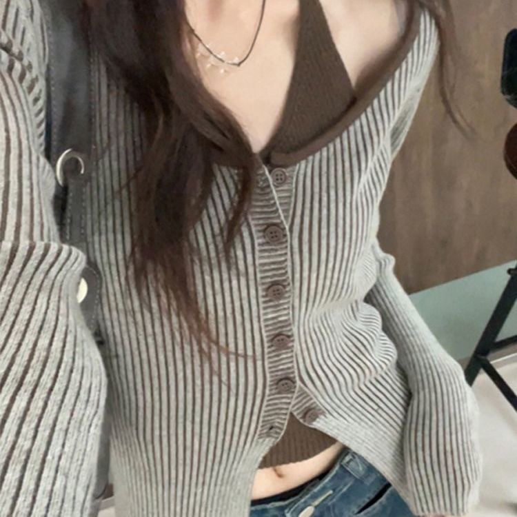 초가을 디자인 센스 페이크 투피스 베이스 니트 카디건 여성복 디자인 센스 틈새 하이 엔드 긴팔 탑