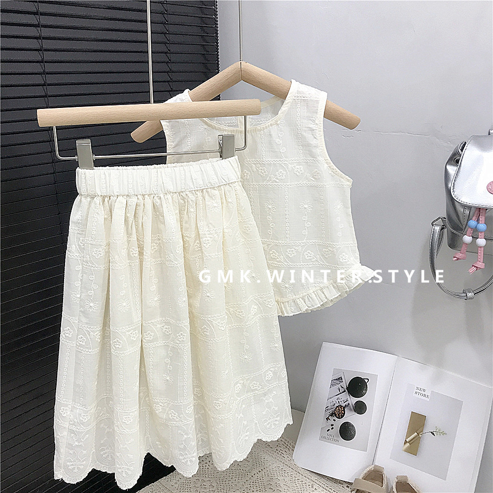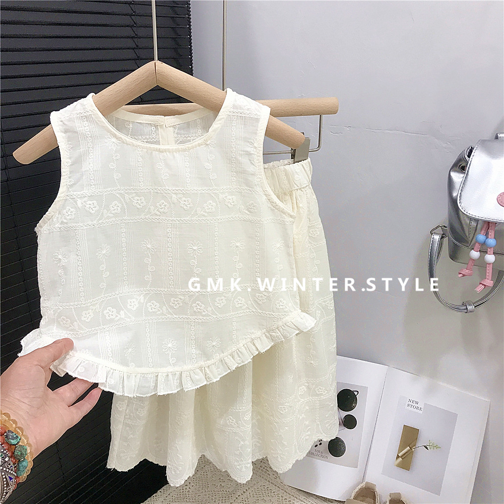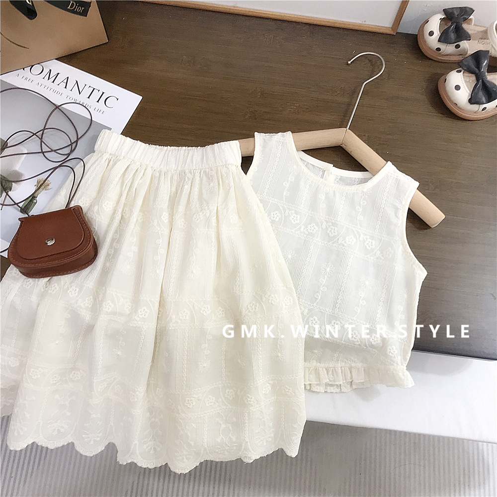 재고 한국 스타일 아동복 여름 새로운 여성 한국 스타일 레이스 세트 유행 조끼 민소매 탑 스커트 투피스 세트스토어 가기