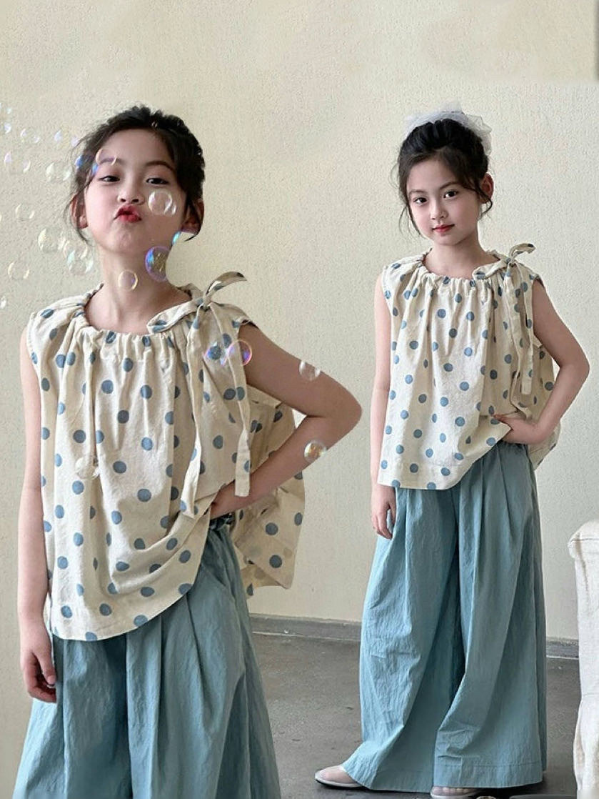 🩵六一专场,miu系蓝色波点夏日暴击❗️被夸爆的‘蓝色治愈系’童装❗️无袖系带波点套装❗️夏日满分穿搭💯今日份蓝色元气美少女已候场❗️随手一拍就是ins风元气大片📸