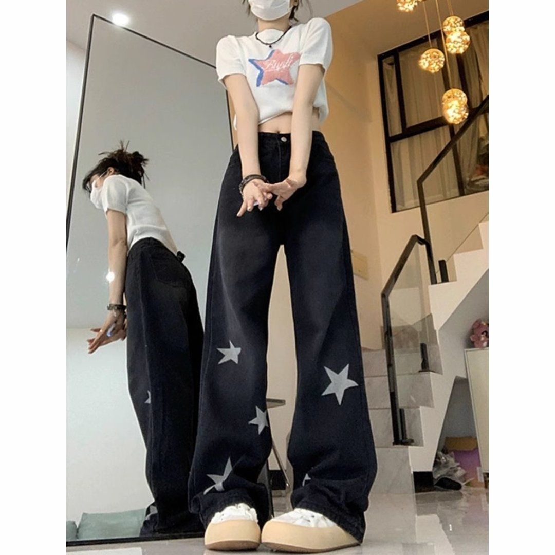 플러스 사이즈 여성 의류 뚱뚱한 mm 스타 스트레이트 데님 바지 여성 아메리칸 레트로 하이 웨이스트 배 모양의 바디 루즈 와이드 레그 팬츠스토어 가기