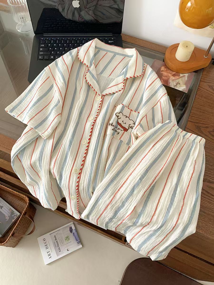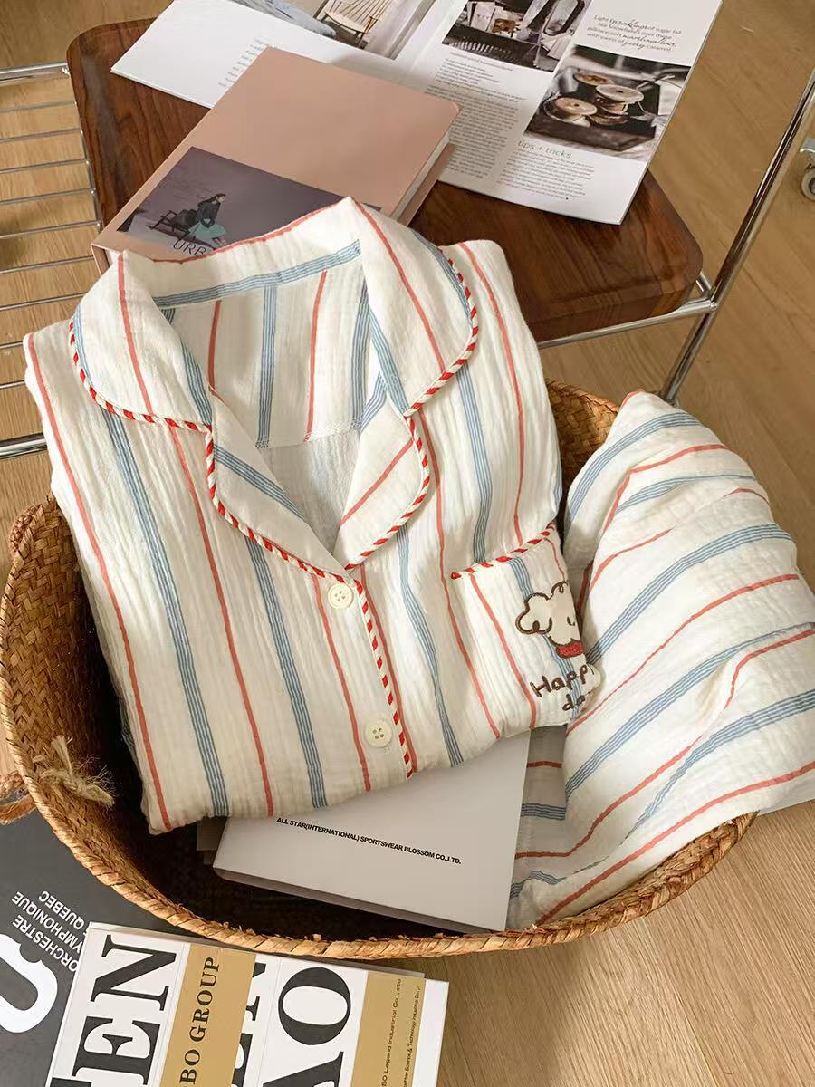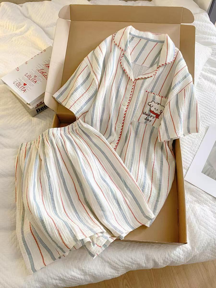 2025 패션 컬렉션 귀여운 만화 줄무늬 개 잠옷 여성의 여름 짧은 소매 반바지 홈 의류 세트