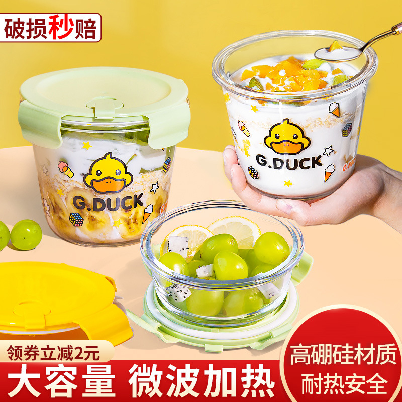노란색 오리 유리 수프 그릇 뚜껑 전자 레인지 난방 도시락 사무실 노동자 도시락 과일 오트밀 컵 보안 제로 용량스토어 가기