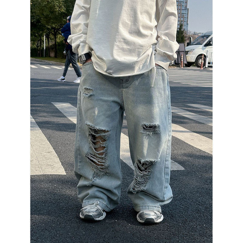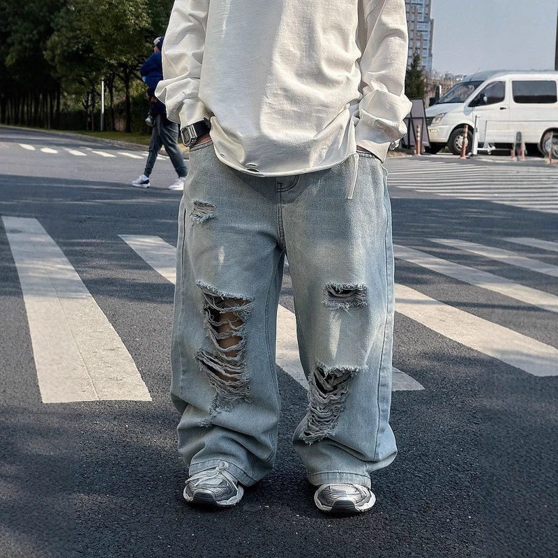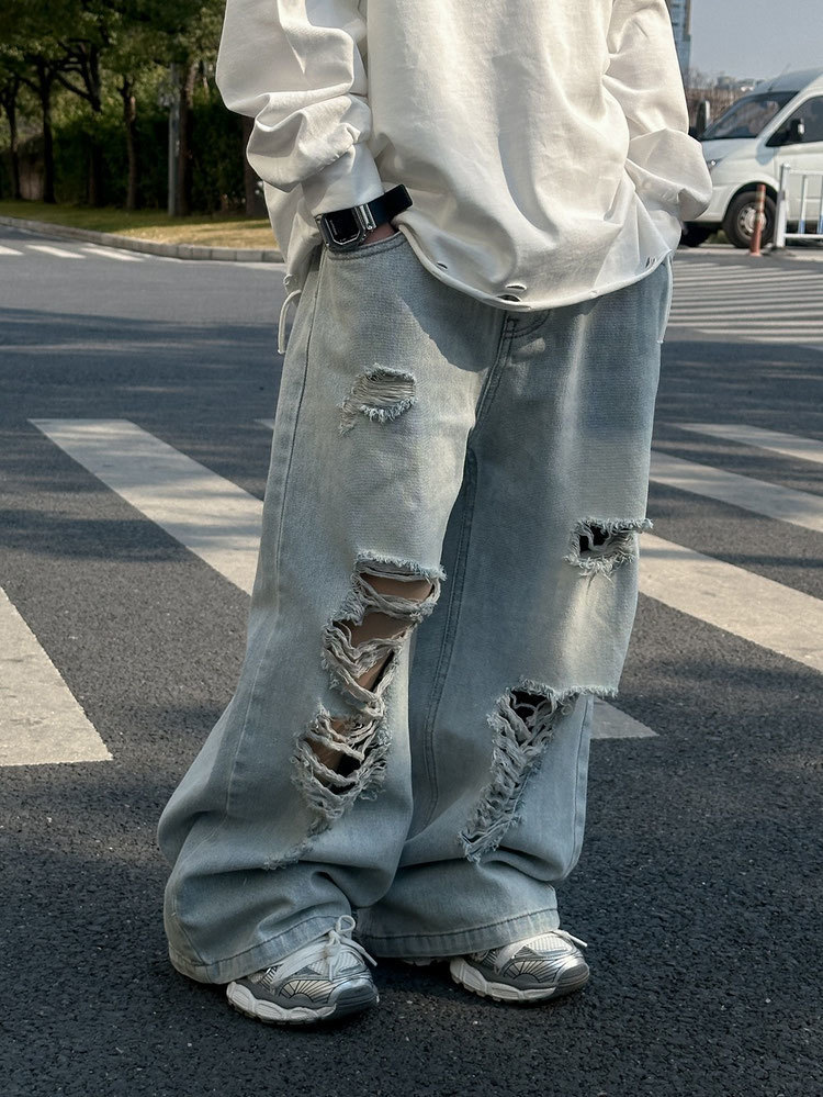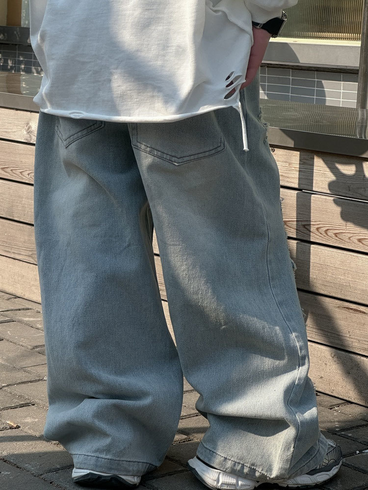• 큰 구멍이 있는 하늘색 청바지