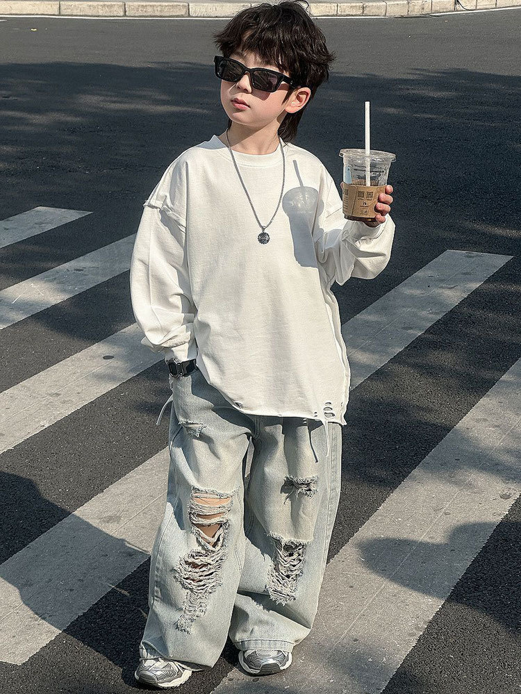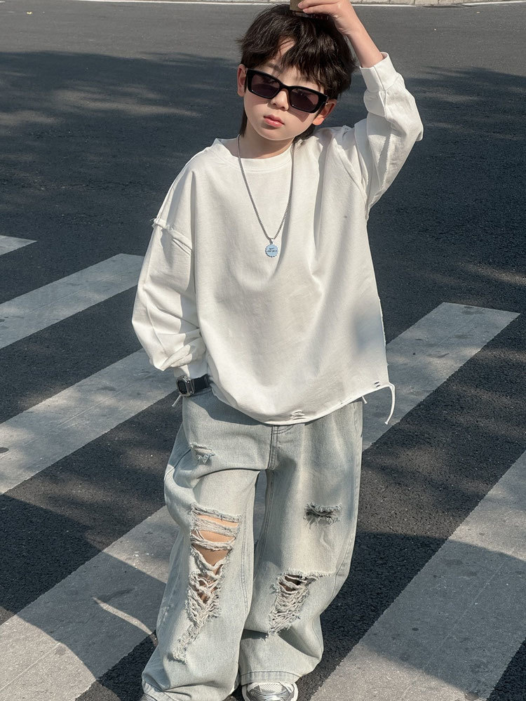 아동용 찢어진 청바지 2025 봄 여름 새로운 루즈 스트레이트 다용도 바지 소년 스타일