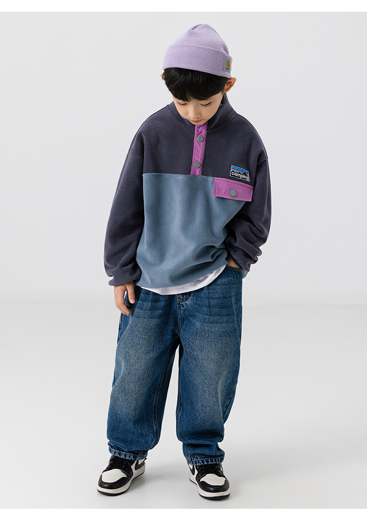 EK 아동복 스플라이스 대비 색상 소년 터틀넥 폴라 플리스 루즈 풀오버 스웨트 셔츠, 중대형 아동용 탑 및 재킷스토어 가기