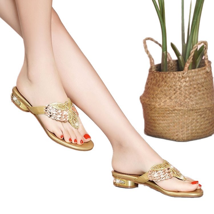 해변 신발 휴가 플립 플롭 여름 겉옷 낮은 굽 2025 여성을위한 새로운 보헤미안 라인 석 슬리퍼스토어 가기