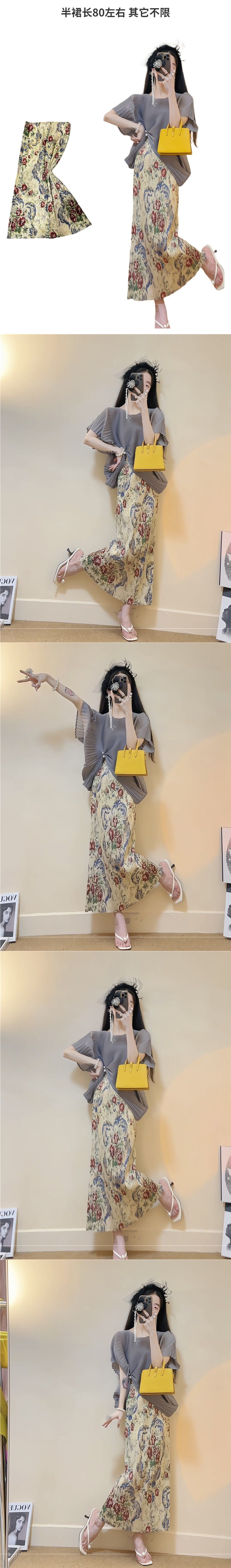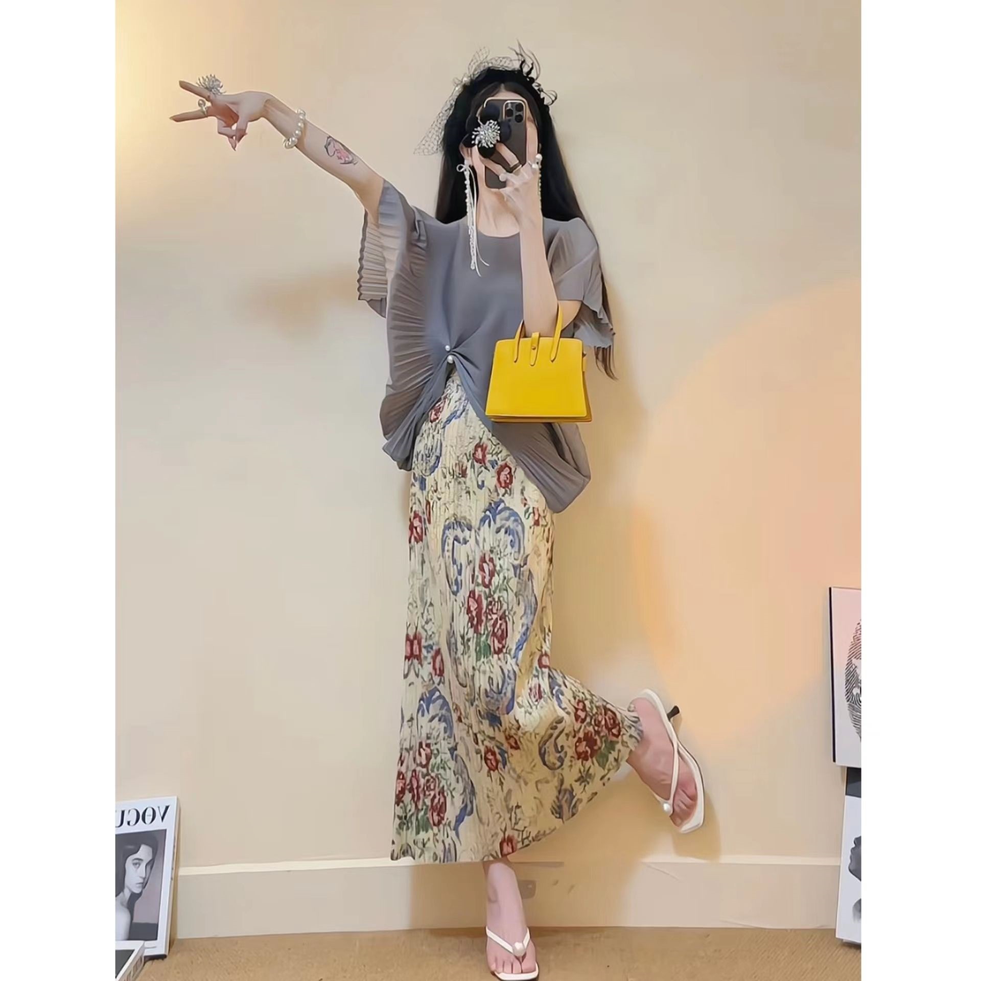 약간 뚱뚱한 여자 세트가있는 여름 원피스 슬림 그레이 주름 짧은 소매 상단 프린트 스커트 세트 착용