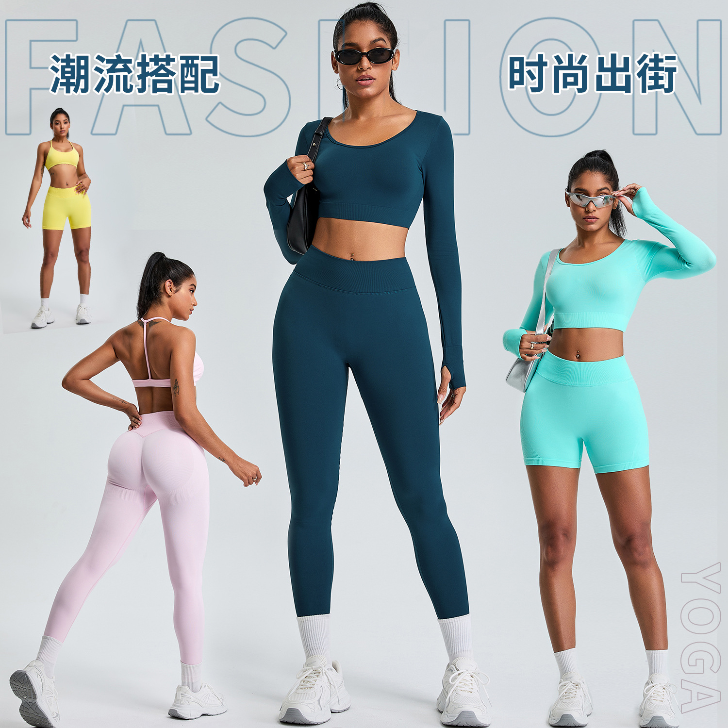 국경을 넘는 새로운 가을 겨울 이음매없는 스포츠 슈트 복숭아 엉덩이 리프팅 야외 달리기 요가 슈트 4 피스 피트니스 슈트