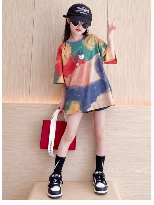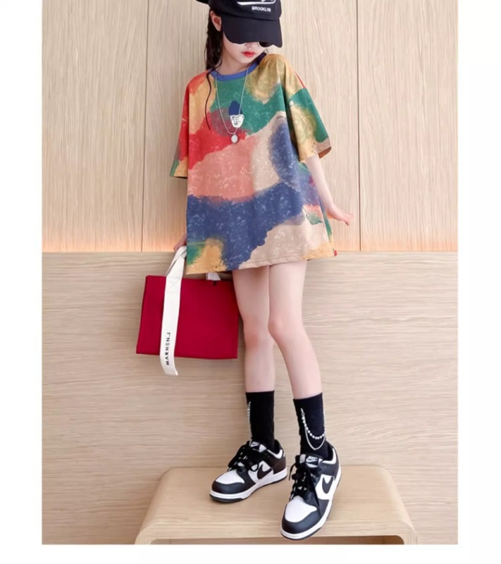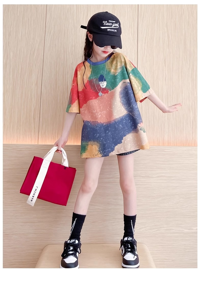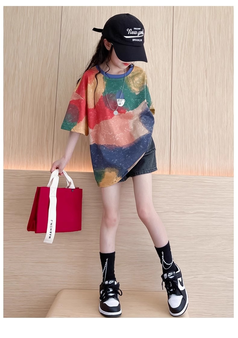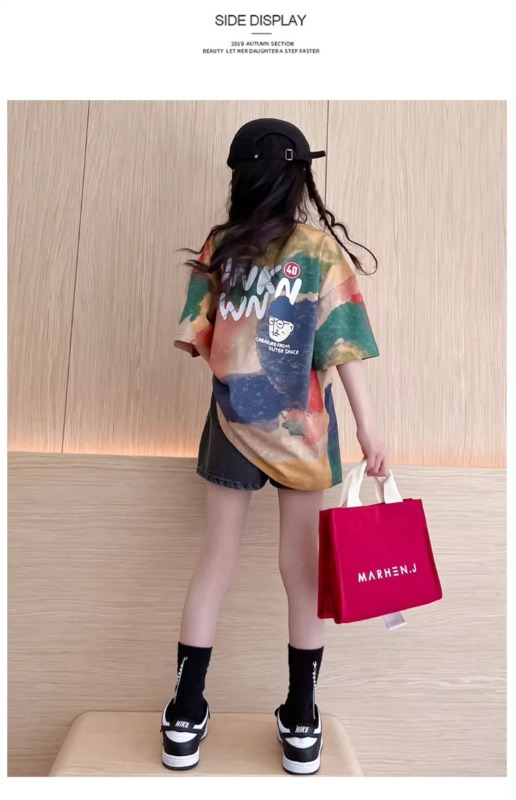 여자 반팔 티셔츠 2025 새 아동복 큰 어린이 느슨한 반팔 여름 여자 여름 서양식 아동복스토어 가기
