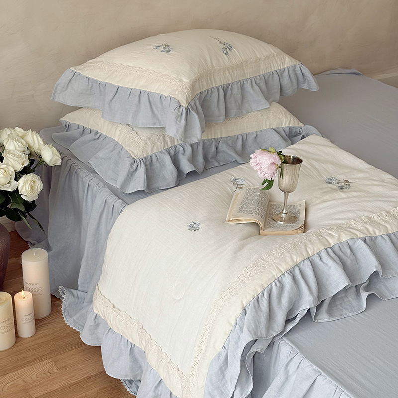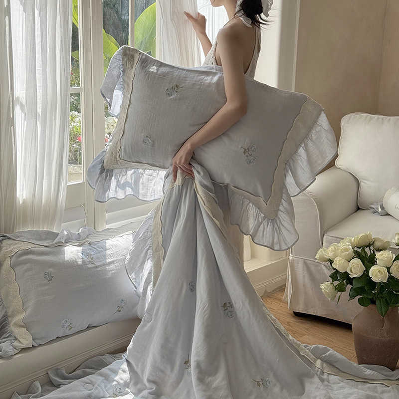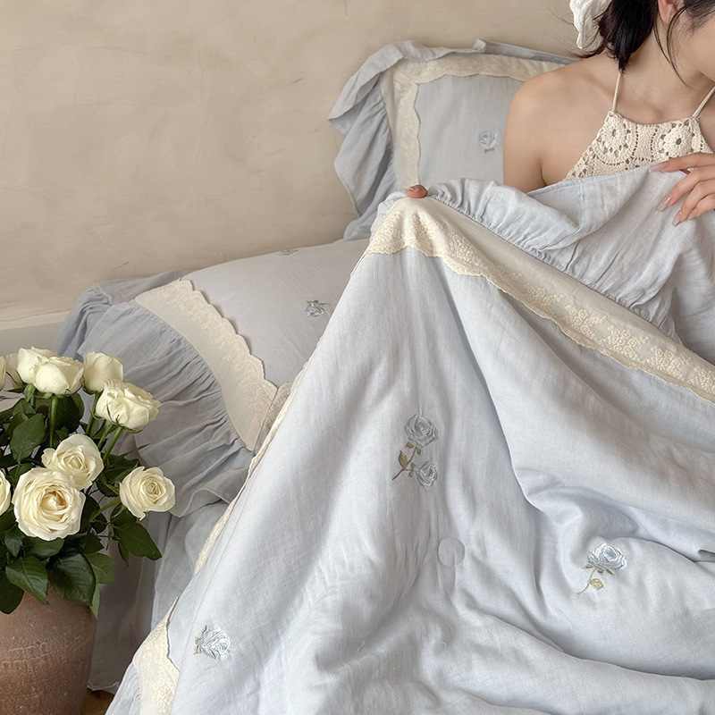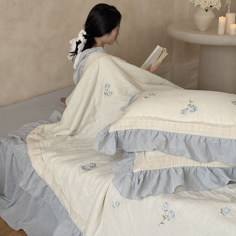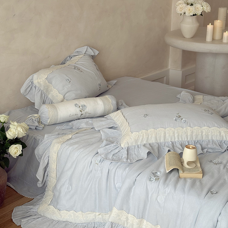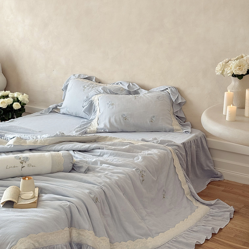 프렌치 침구 여름 이불 순면 주름진 이중 원사 알몸 수면 부드러운 에어컨 이불 세탁기로 세탁 가능한 여름 시원한 이불 4종 세트