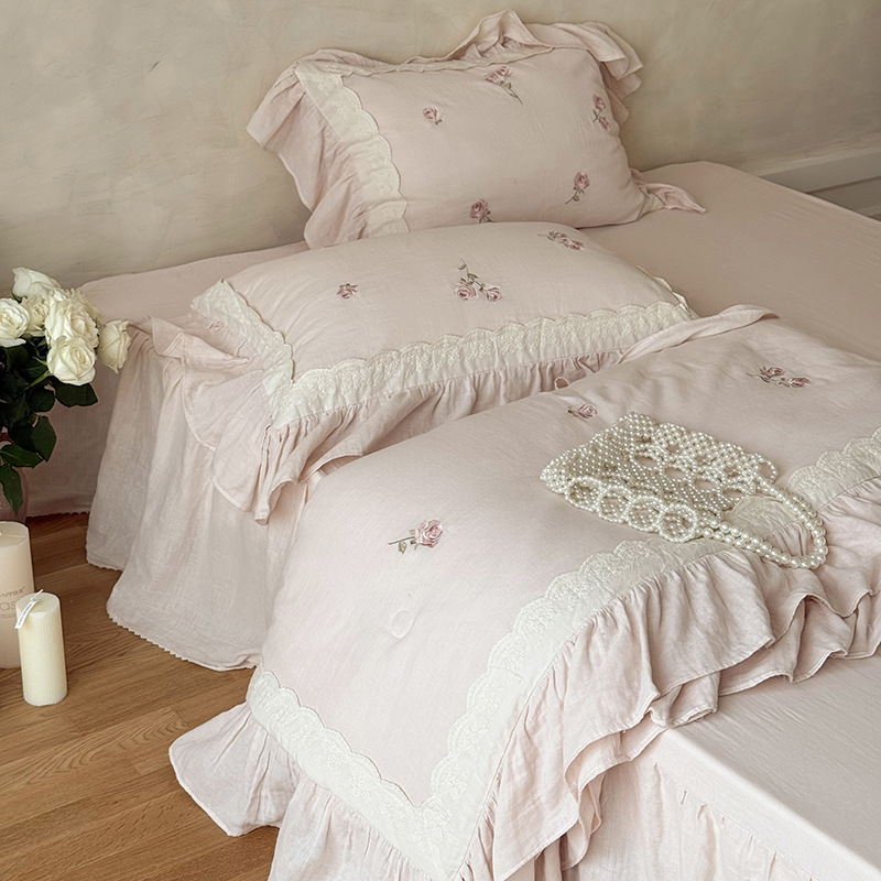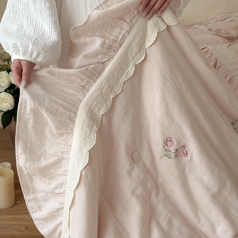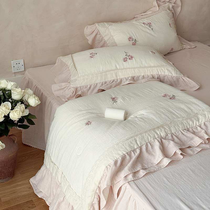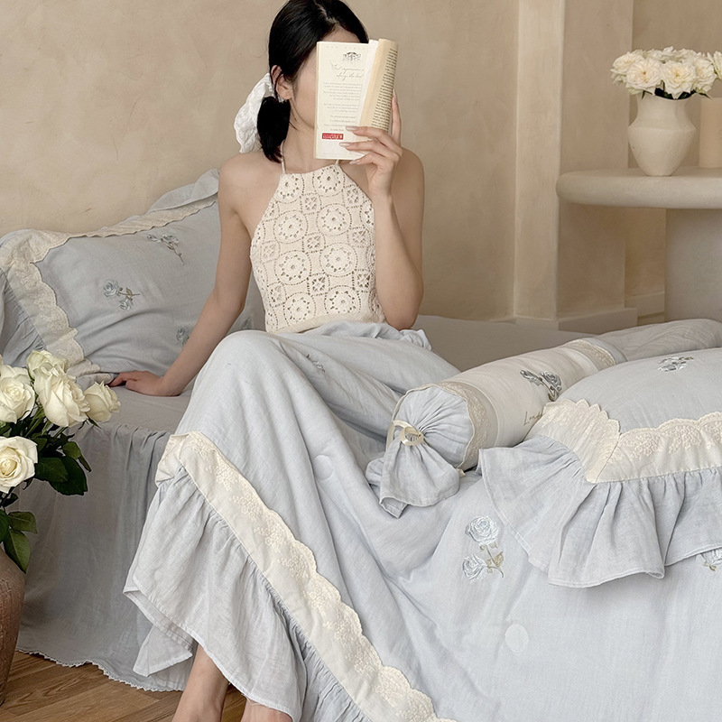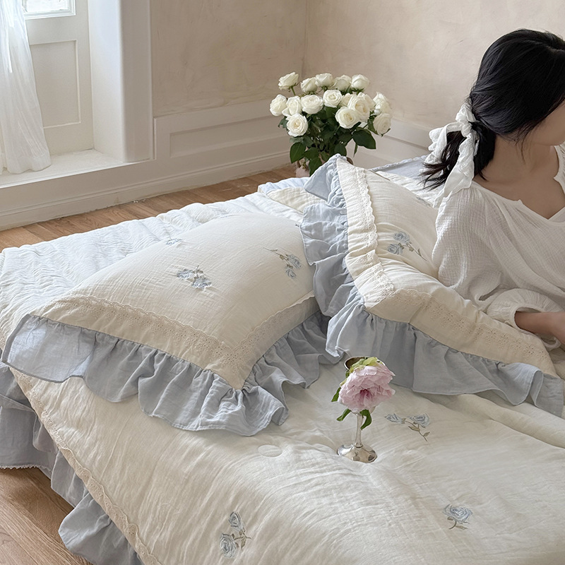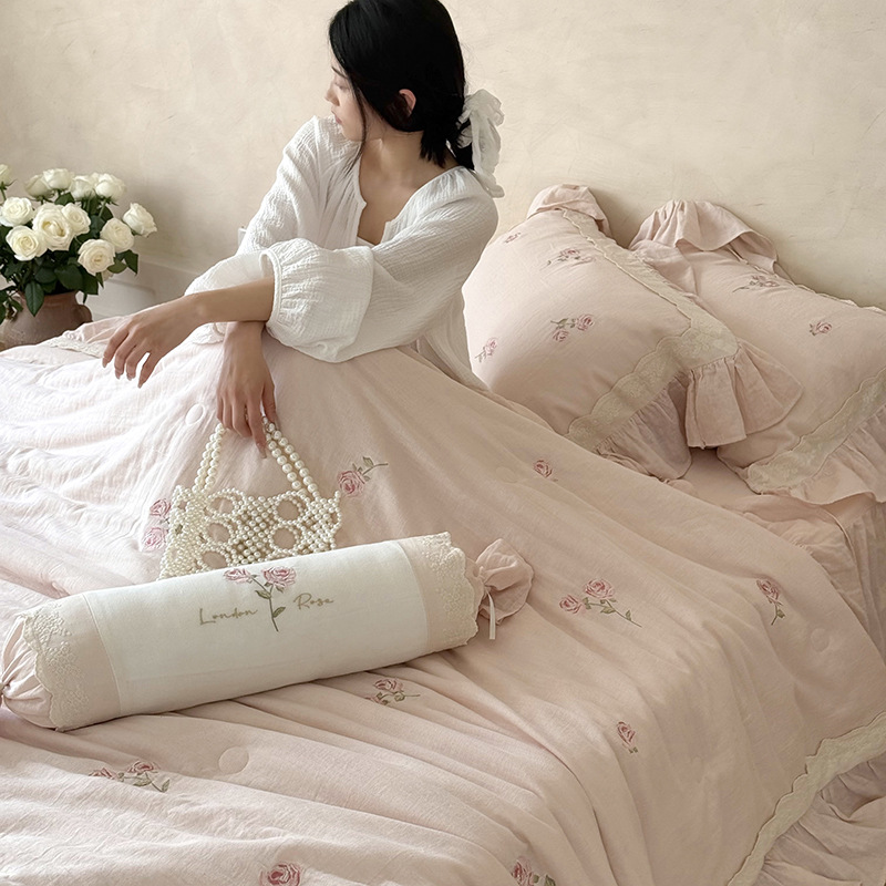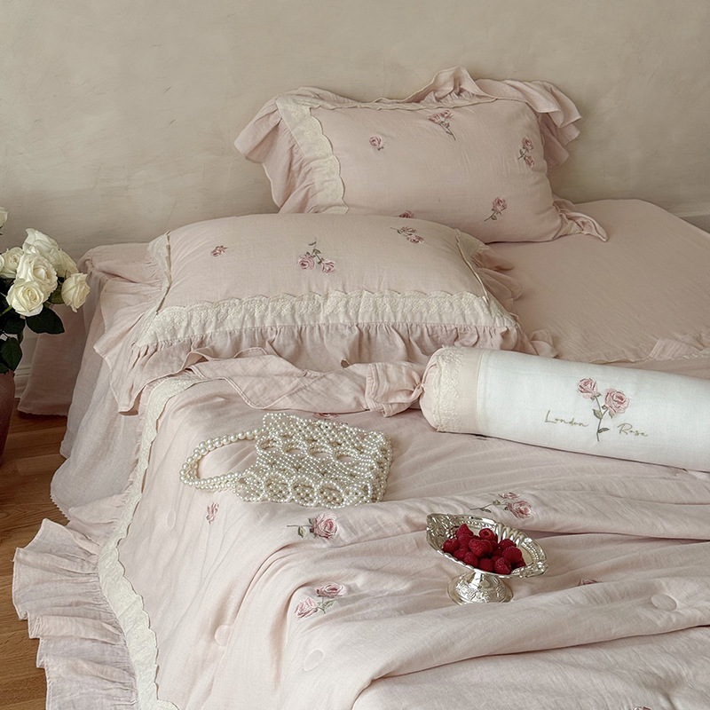 프렌치 침구 여름 이불 순면 주름진 이중 원사 알몸 수면 부드러운 에어컨 이불 세탁기로 세탁 가능한 여름 시원한 이불 4종 세트