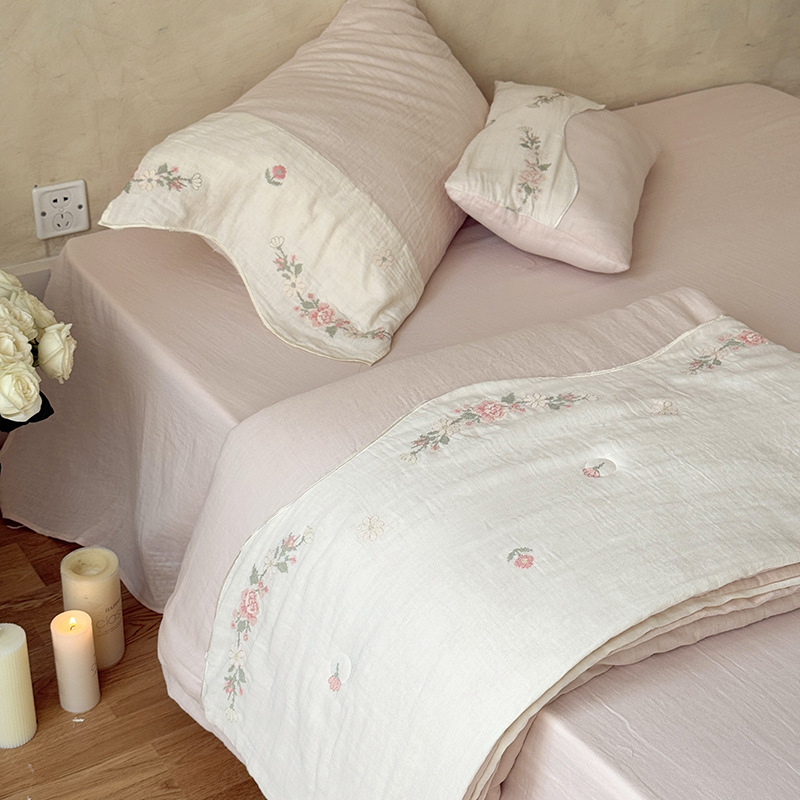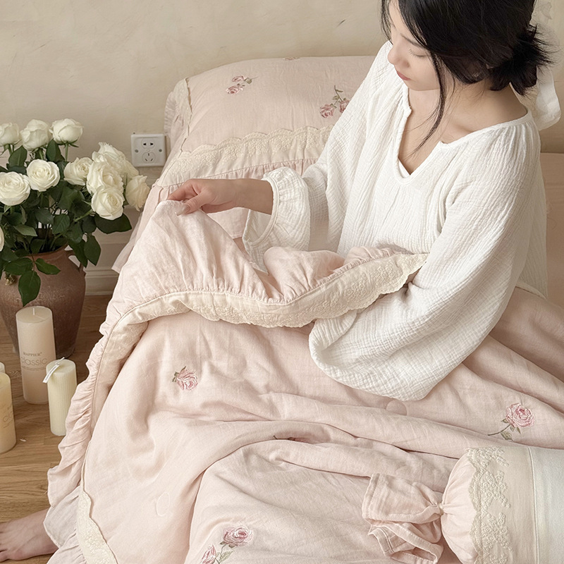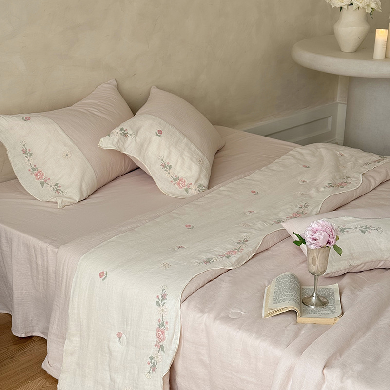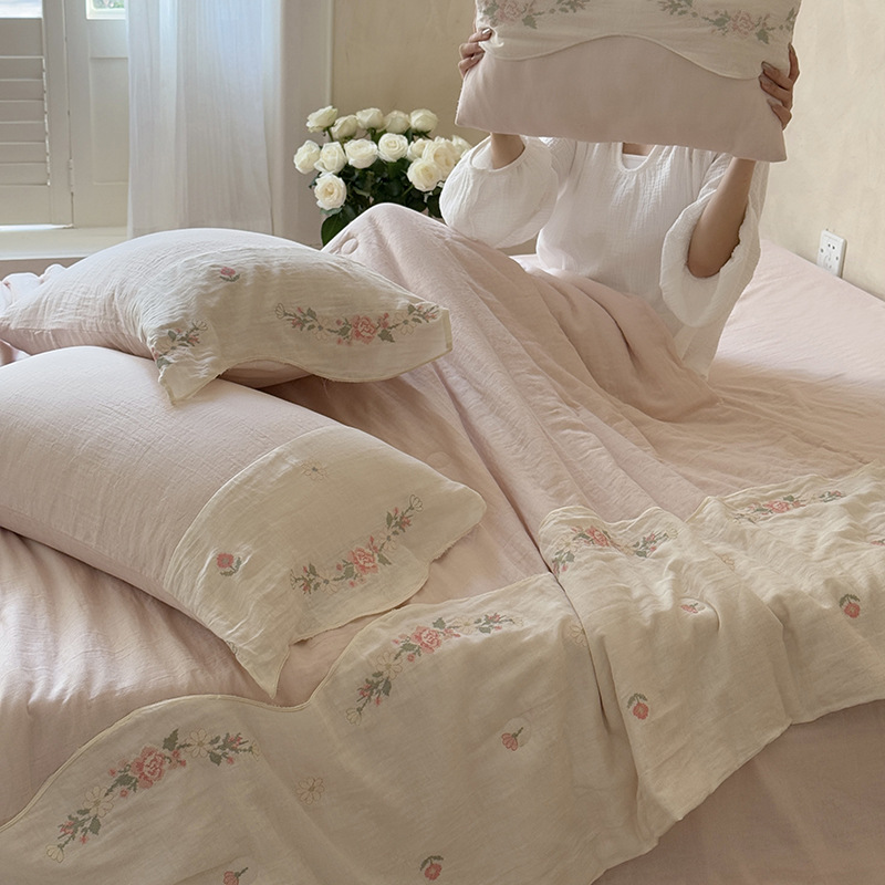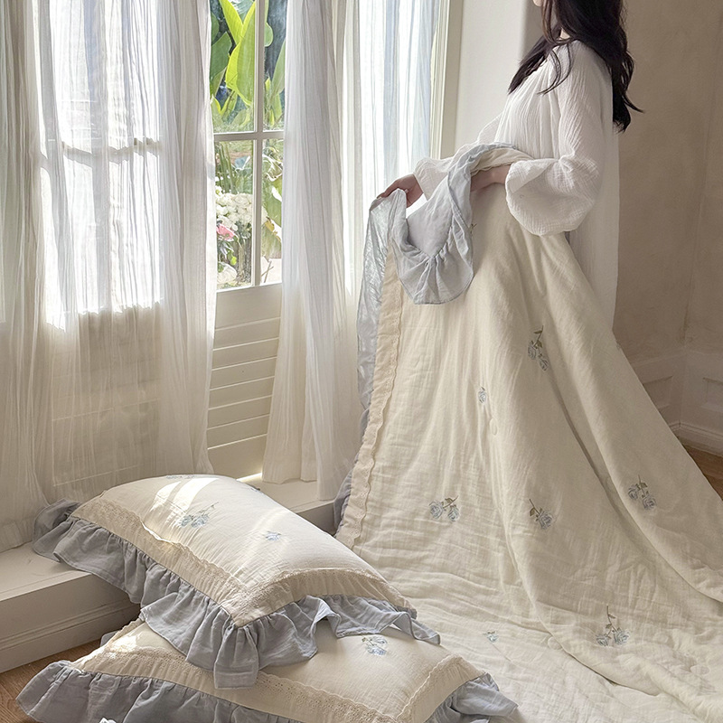 프렌치 침구 여름 이불 순면 주름진 이중 원사 알몸 수면 부드러운 에어컨 이불 세탁기로 세탁 가능한 여름 시원한 이불 4종 세트스토어 가기