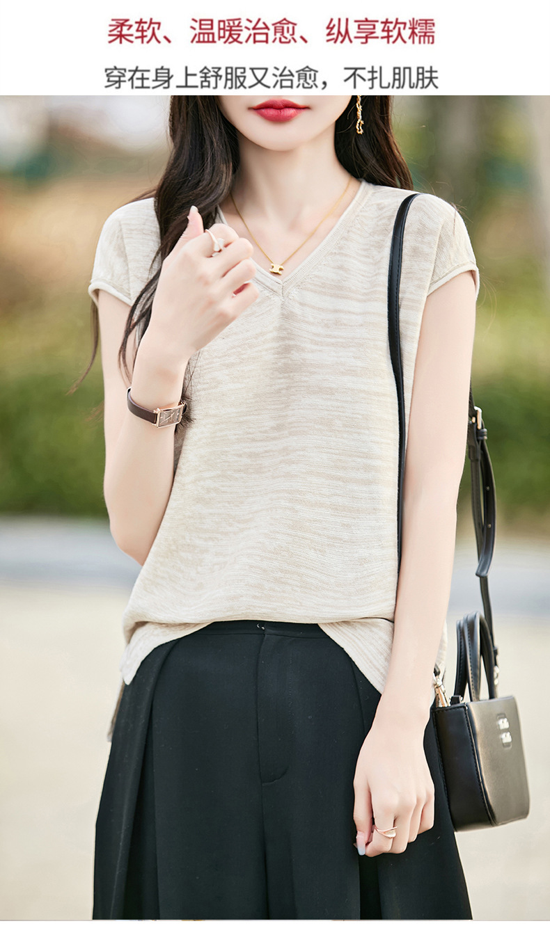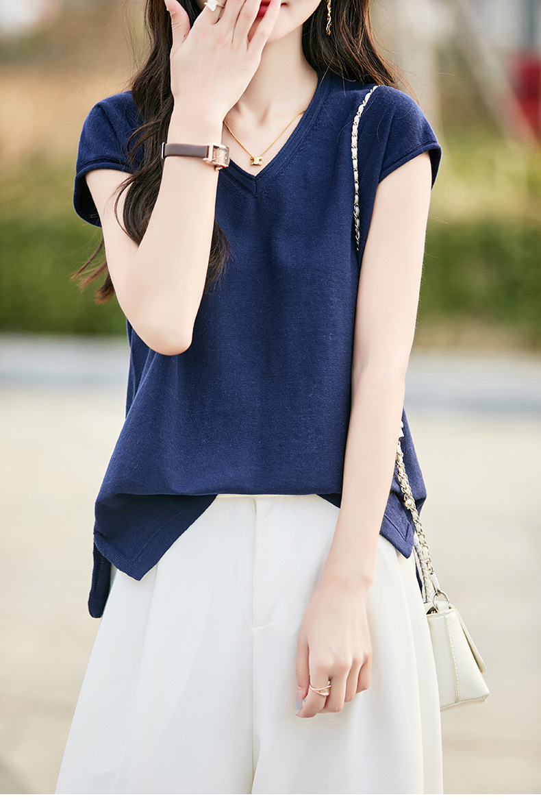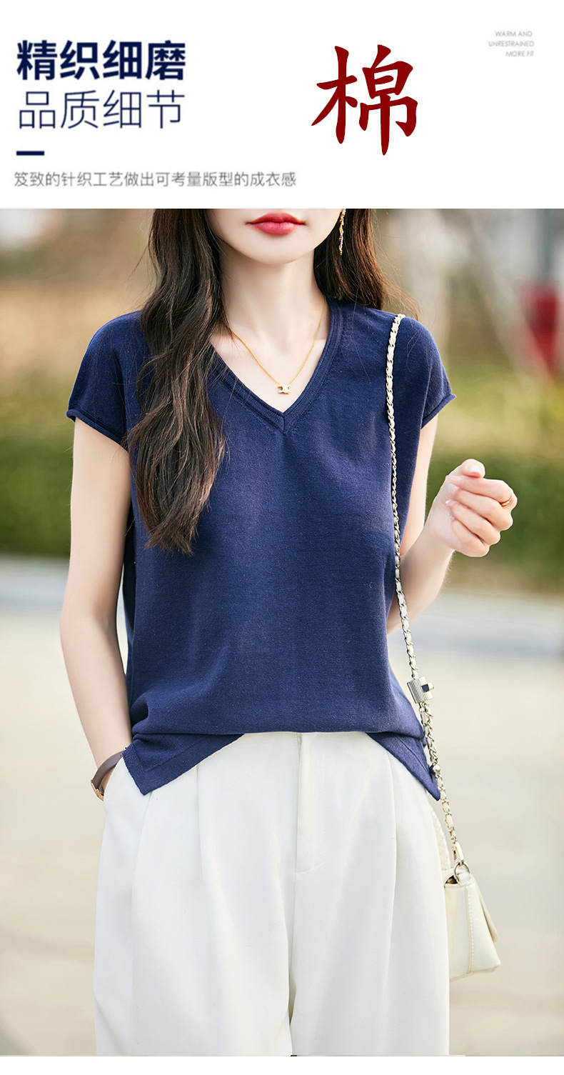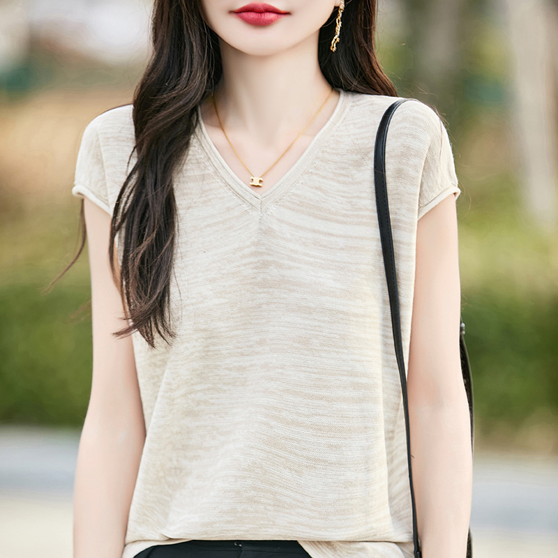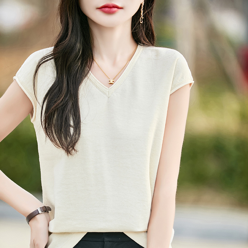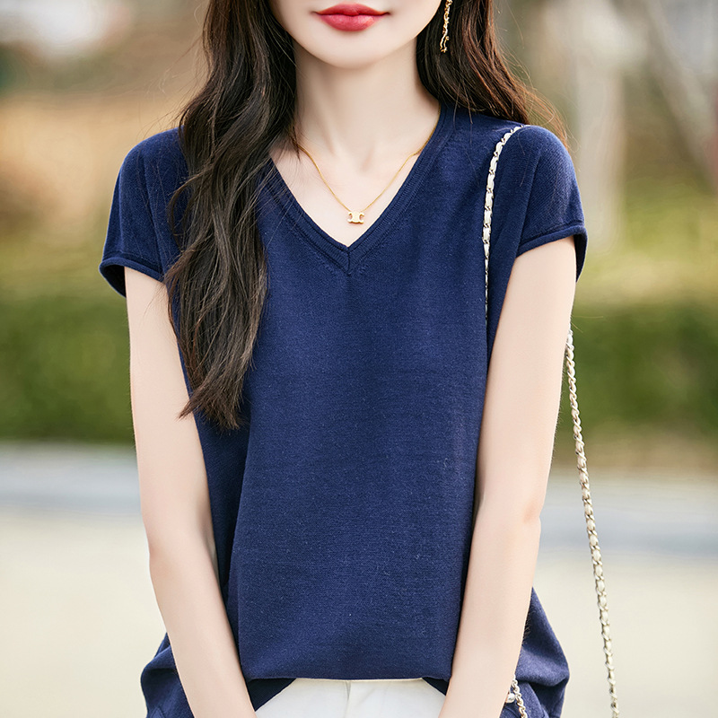 여름 순수한면 V 넥 니트 반팔 티셔츠 여성용 느슨한 슬리밍 내베이스 셔츠 얇은 캐주얼 탑 도매스토어 가기