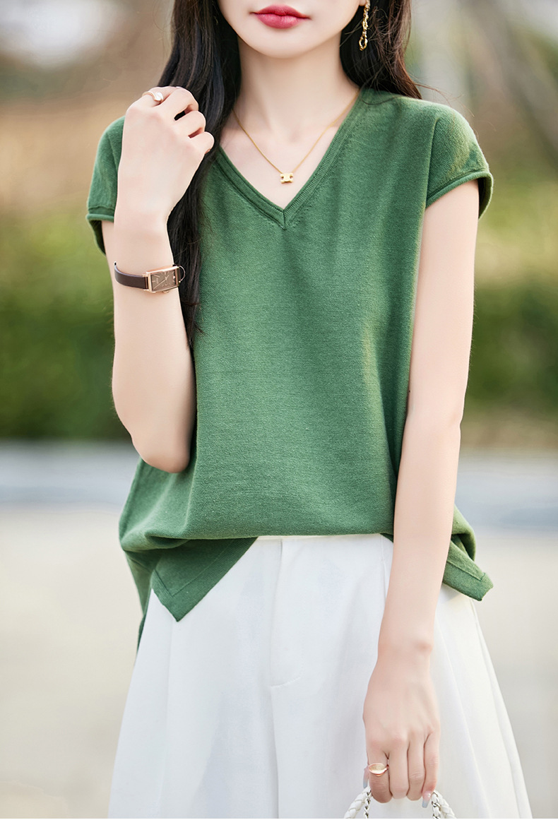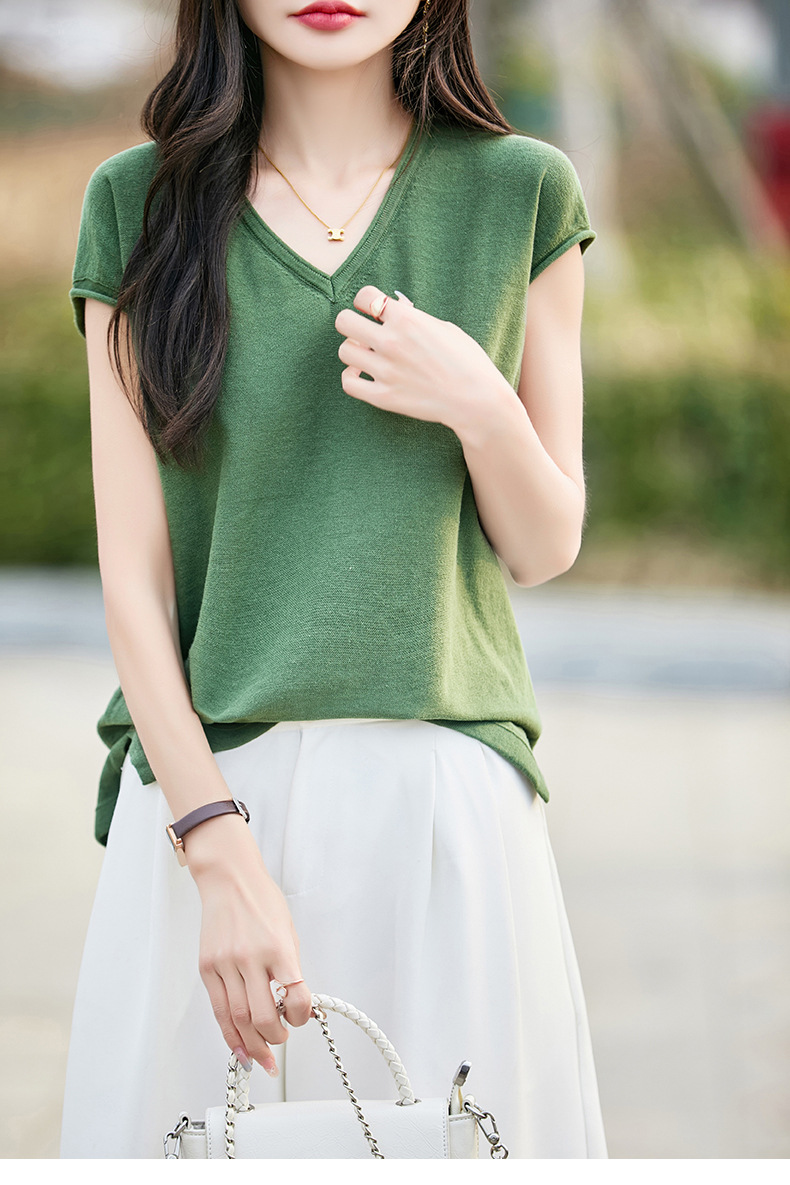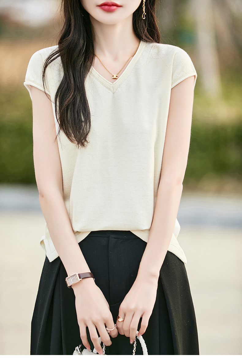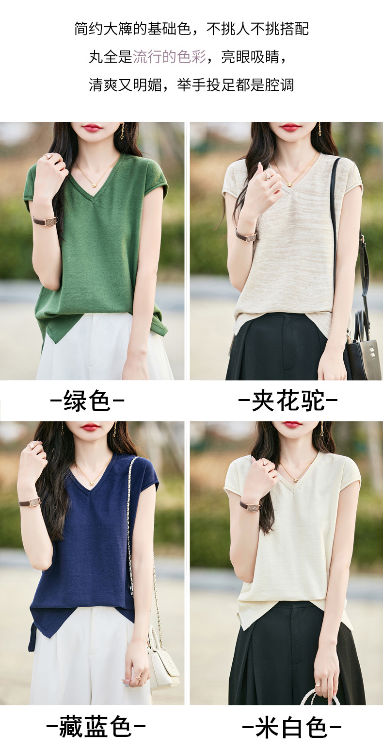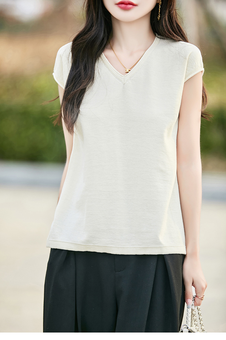 여름 순수한면 V 넥 니트 반팔 티셔츠 여성용 느슨한 슬리밍 내베이스 셔츠 얇은 캐주얼 탑 도매스토어 가기