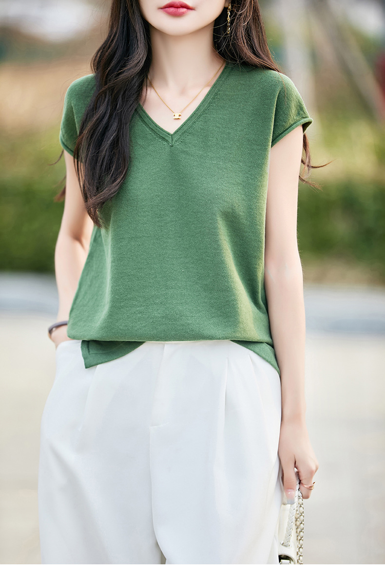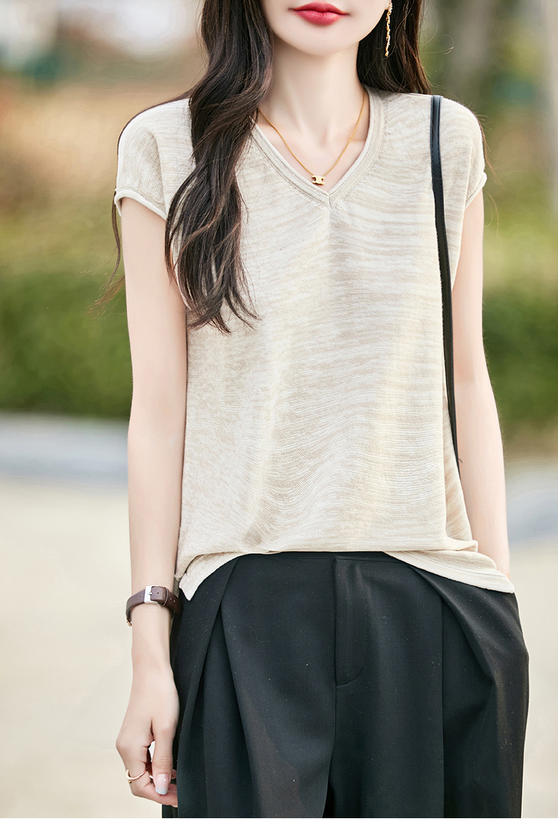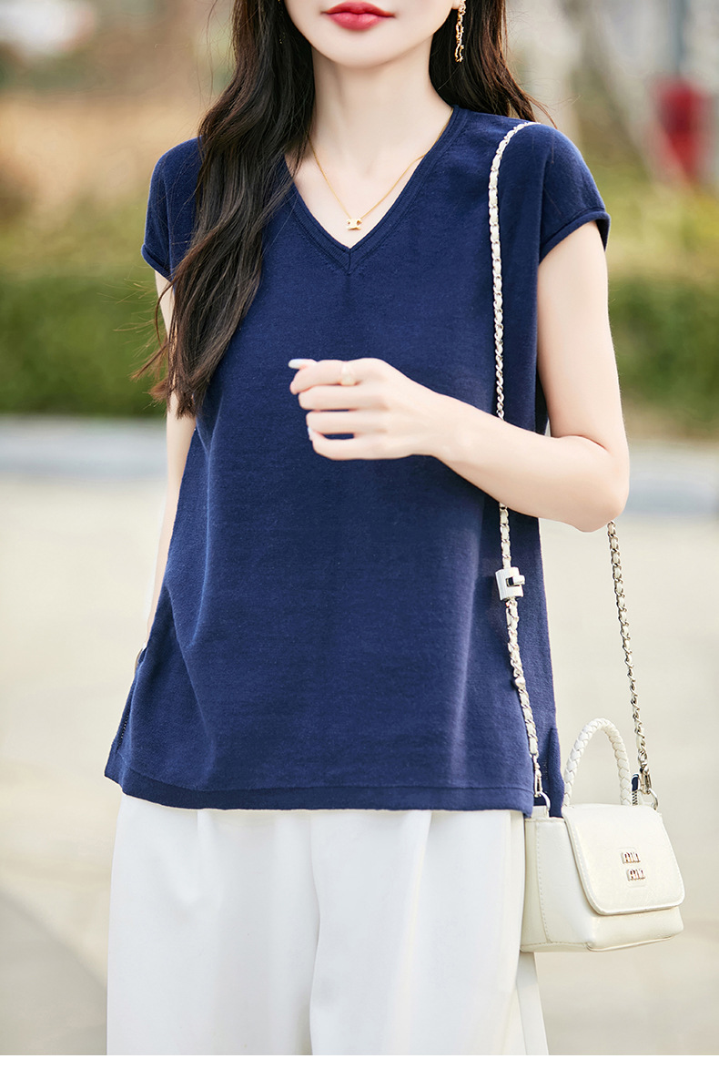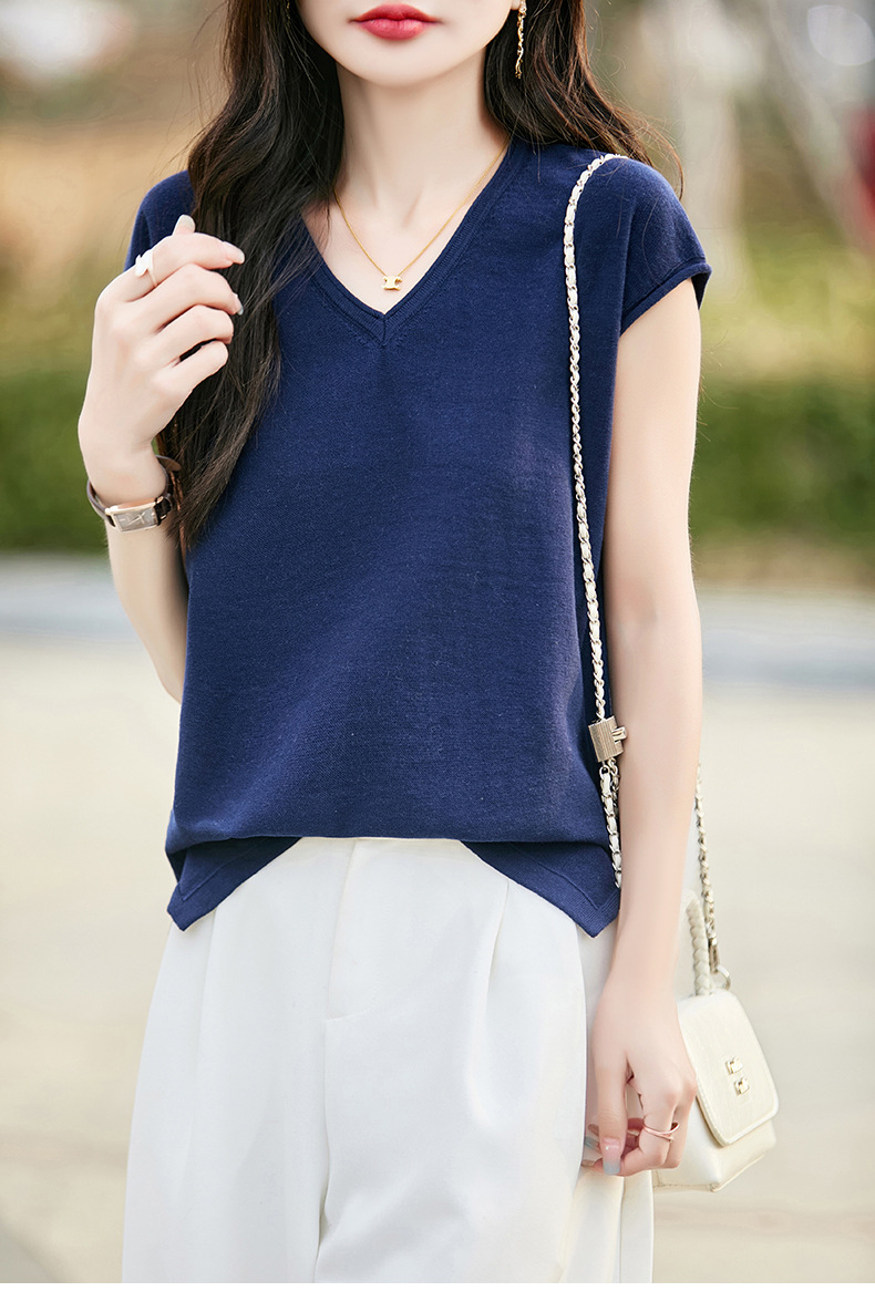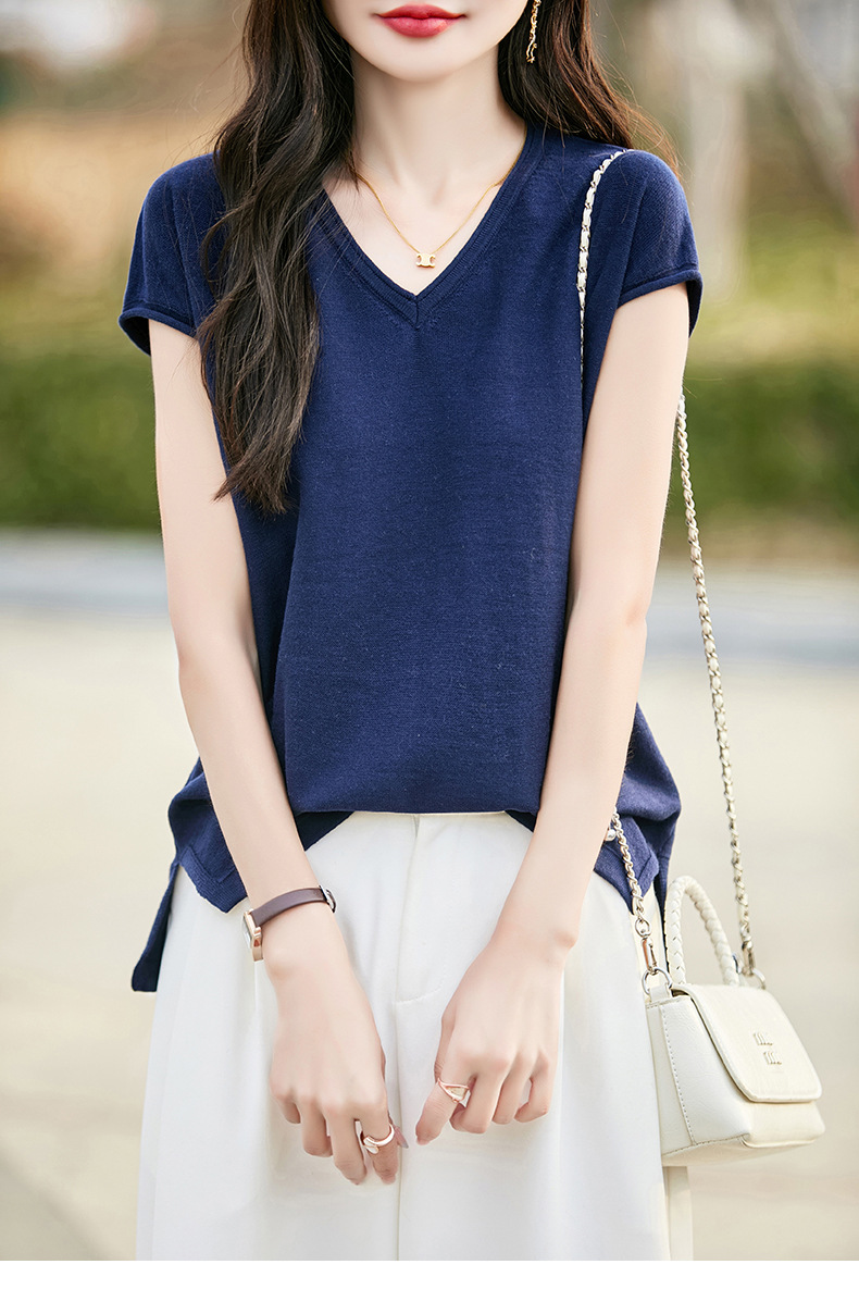 여름 순수한면 V 넥 니트 반팔 티셔츠 여성용 느슨한 슬리밍 내베이스 셔츠 얇은 캐주얼 탑 도매스토어 가기