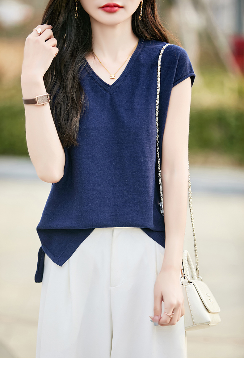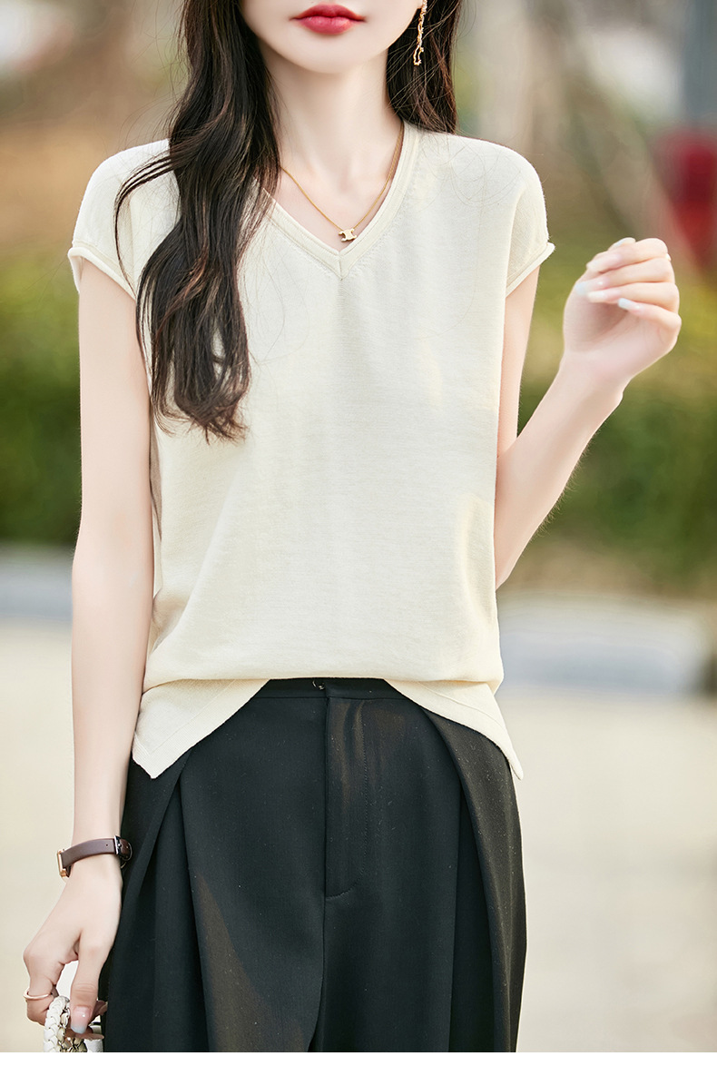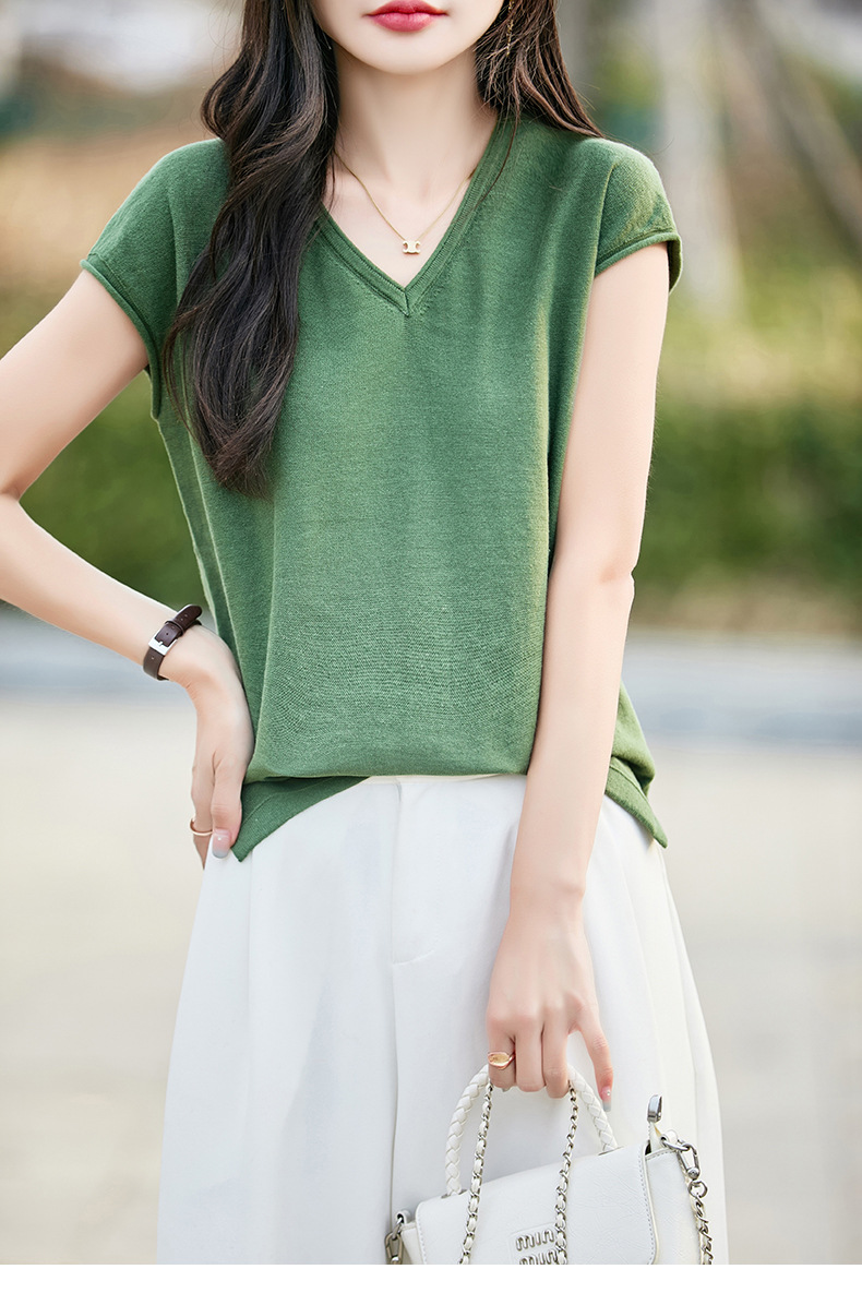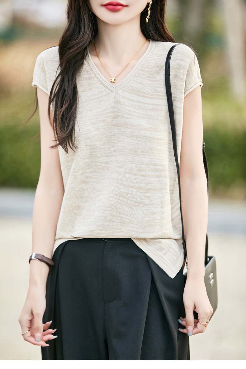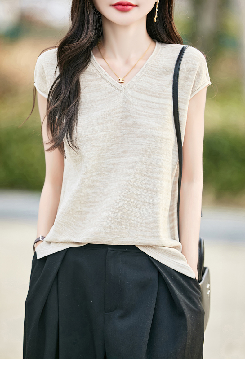 여름 순수한면 V 넥 니트 반팔 티셔츠 여성용 느슨한 슬리밍 내베이스 셔츠 얇은 캐주얼 탑 도매스토어 가기