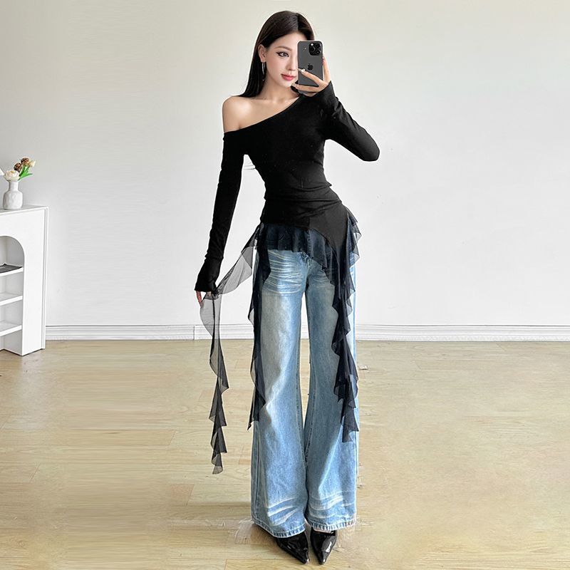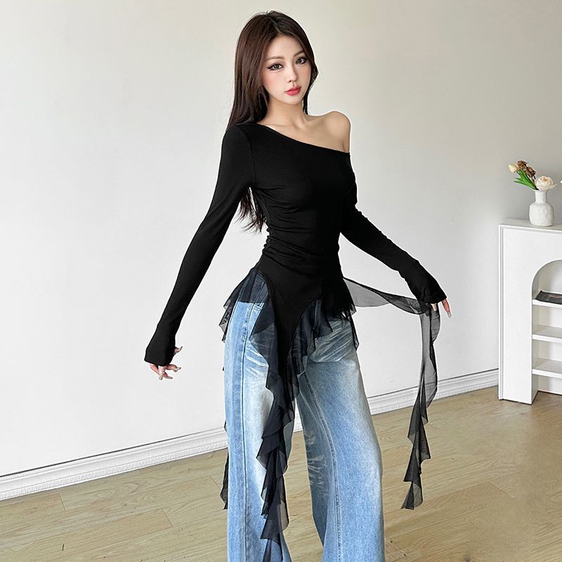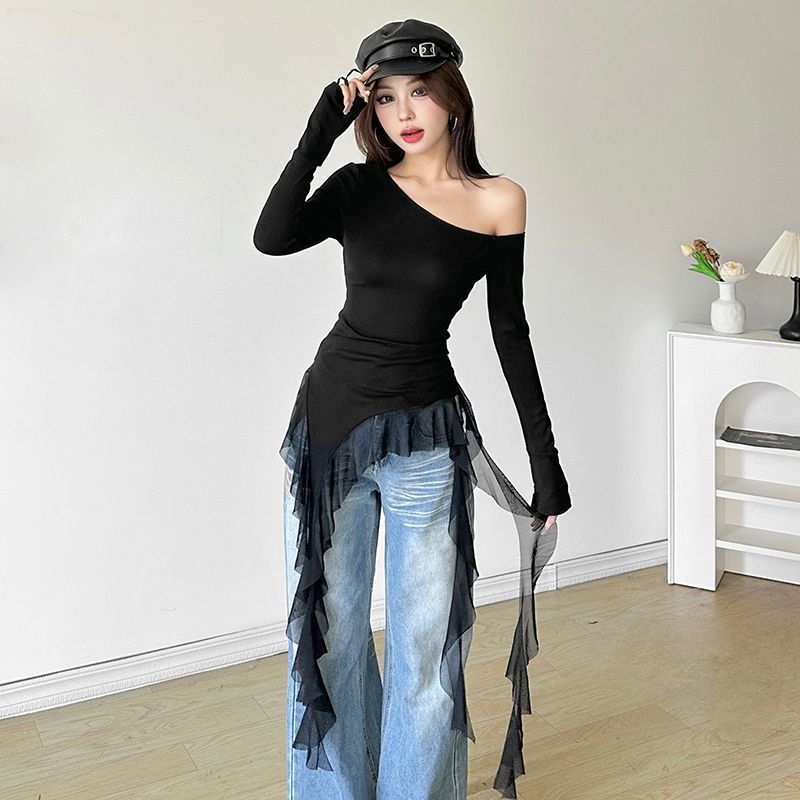 气质甜辣御姐风荷叶边拼接斜肩长袖T恤女小众不规则显瘦上衣秋