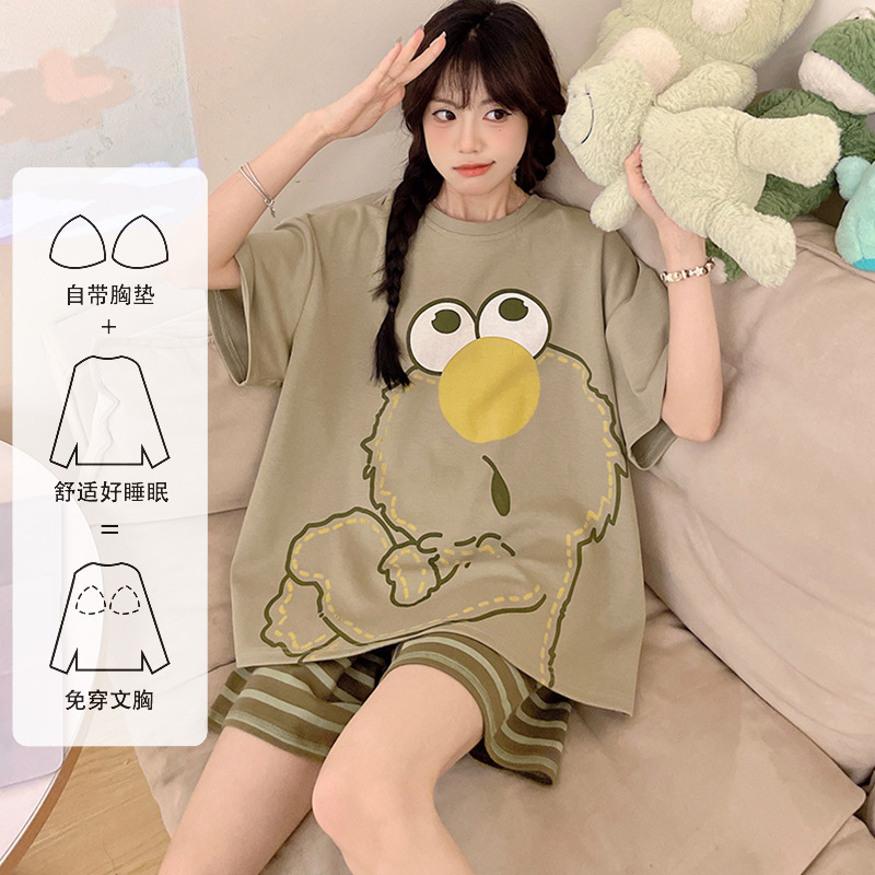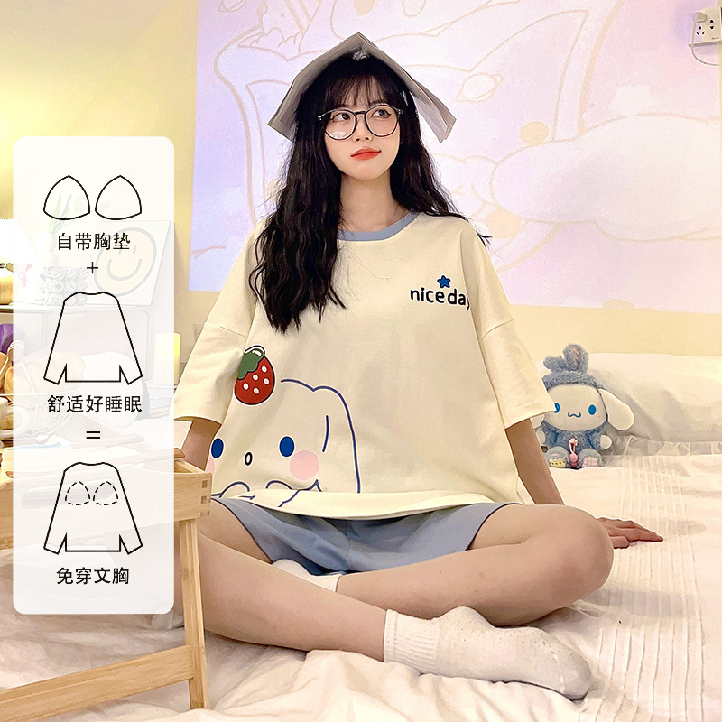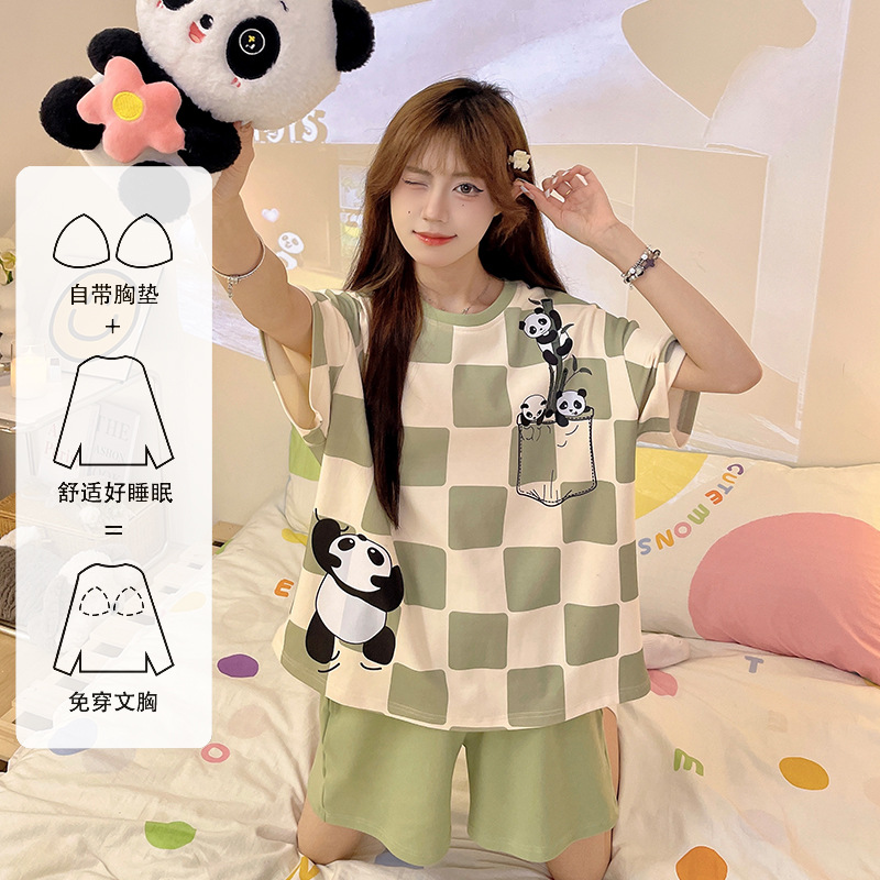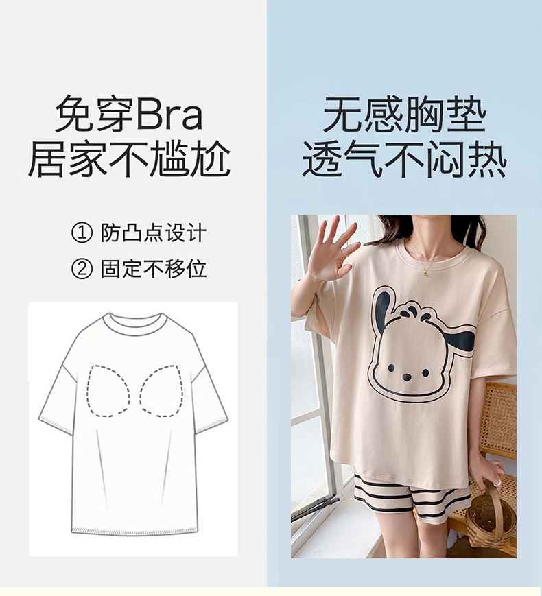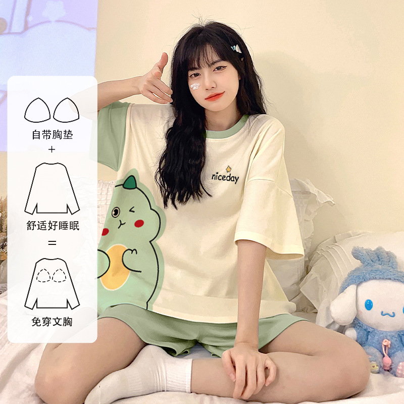 여름 시원한 잠옷 여성용 반팔 캐주얼 귀여운 만화 통통녀 가슴 패드 투피스 세트와 경량 편안한 홈 웨어스토어 가기